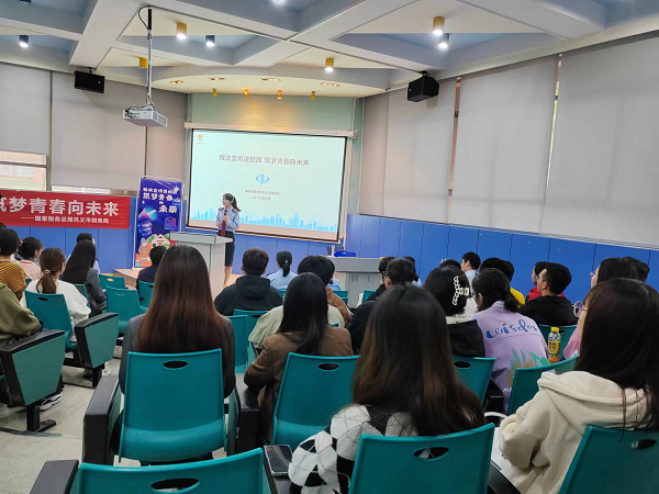 在会谈后,巩义市税务局一分局副局长何柯在2116针对财管和税收学专业100余名学生开展了“税法宣传进校园,龚梦青春向未来”的知识讲座,讲座过程中同学就税收涉及的领域,未来就业的前景等向主讲老师咨询,纷纷表示在对专业前景更加充满信心。