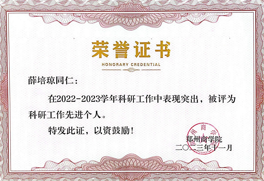 学期初吴校长在教职工大会上指出“提质增效、强化应用,全面提升科研服务能力”。学校对科研的重视和支持,让全体教职工意识到科研的重要性,也让科研的种子在薛老师心中生根发芽。2022-2023第二学期,薛老师教学任务繁重,负责多位学生毕业论文的定稿、答辩和归档材料工作,同时还兼任学院试卷专项。4月16日晚上,刚在武汉结束历时三天的科研研讨会,十点多才进家门,尽管已经身心俱疲,尽管第二天还有满满的一周实训课,但是他依然折返到办公室,用三天的学习心得完善修改河南省教育厅人文社科申报书,一直到凌晨三点才在截止日期内提交申报。在如此巨大的工作量下,他始终坚持不懈,只要有名额,就绝不错过任何一个申报机会。本学期完成申报了8个项目,立项河南省教育厅重点科研一项,河南省教育厅人文社科一项,河南省社科联课题一项,郑州兴文化工程文化研究专项一项,河南省民办教育协会课题一项,beat365唯一官网校级教改重点课题一项。同时还荣获河南省社科联一等奖一项,河南省民办教育协会一等奖一项。