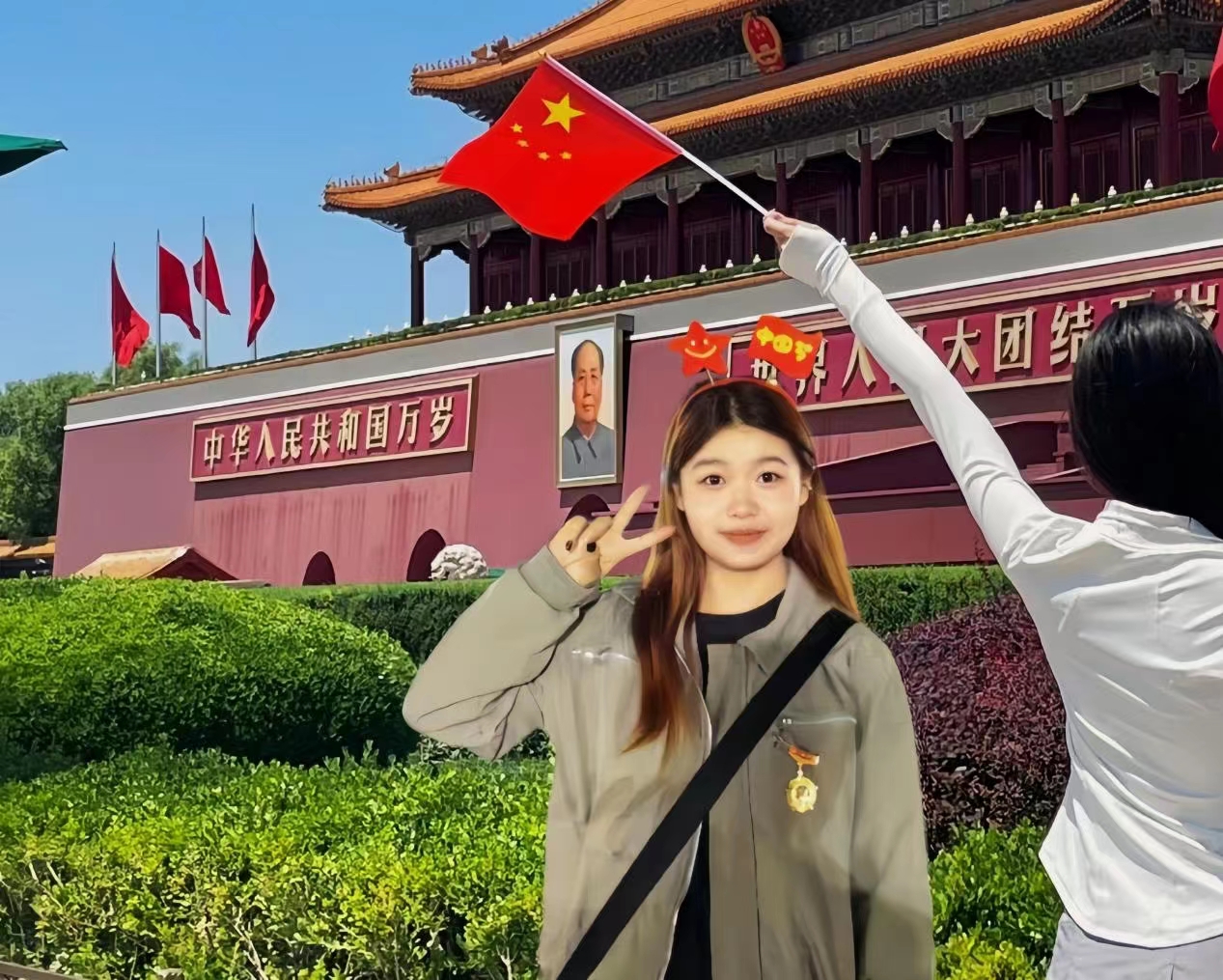 21数财1班张佳鑫说:2023年10月1日,我去天安门广场看了升旗,该怎么描述这一夜呢,是提前一周卡点预约成功的激动,是广场内人挤人席地而坐聊天的欢乐,是和来自五湖四海的中国人民一起踩着零点的祝福祖国生日快乐的心情,是寒风下九小时的漫长期待,晨六时许东边逐渐泛起旭光万众瞩目的时刻即将到来。军乐声响起仪仗队官兵扛着鲜艳的五星红旗一步步向着人民走来,战士们的鞋履整齐地碰撞着长安街道,一步步踏进我的内心是坚毅、是气魄、是伟大。升国旗奏国歌,飘扬的五星红旗,整齐响亮的歌声,盘旋在天安门的和平鸽,千言万语只能汇成一句话:祖国万岁!我们生在红旗下长在春风里,以青春之名书写清澈挚爱。