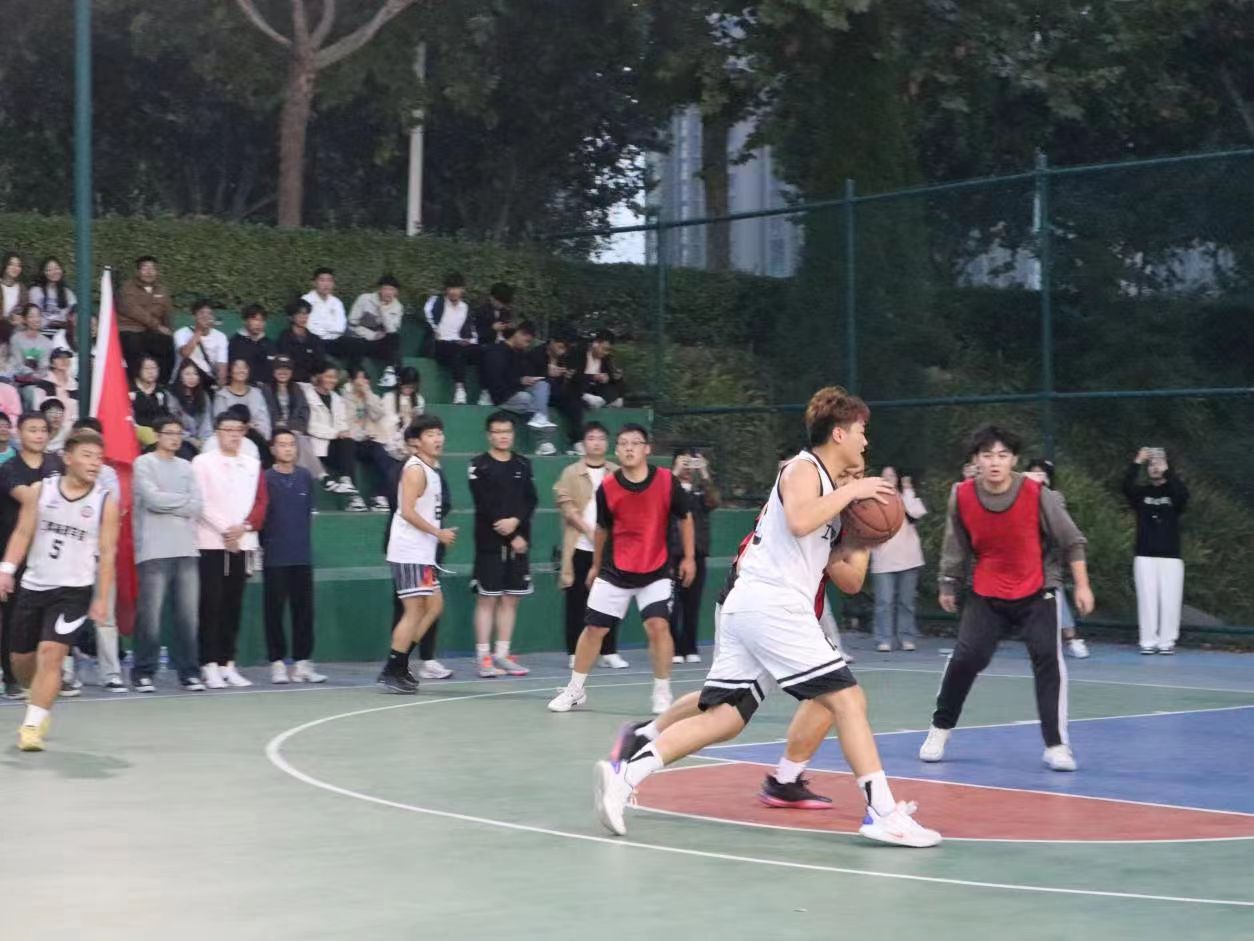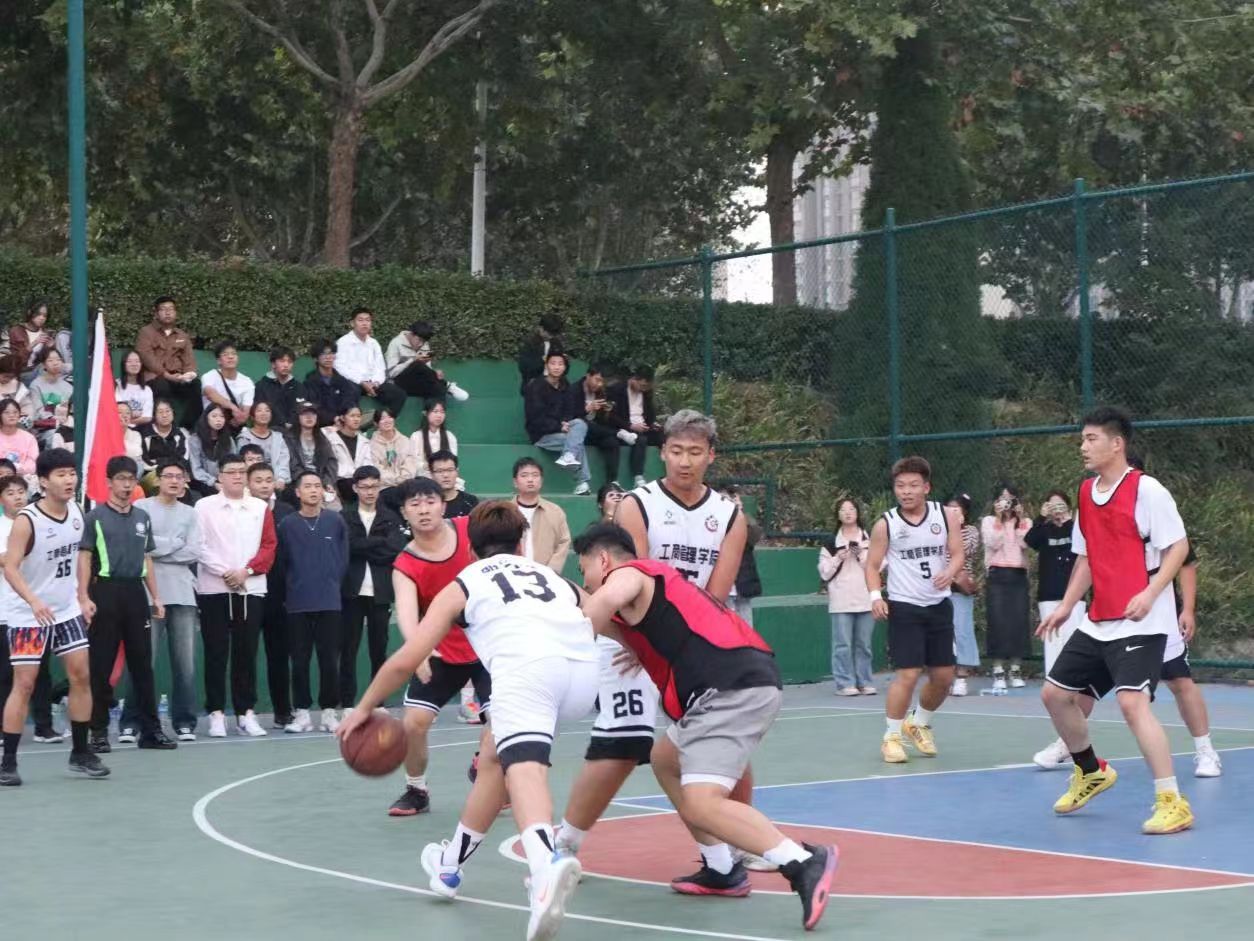 随着裁判哨声的响起,管理学院最后一场小组赛正式开始。赛场上,球员们制定战术、踏着矫健的步伐、紧密合作。比赛正在紧张有序地进行,追赶、防守、传球、上篮……球员们身姿矫健、抢夺激烈、防守攻击、不断变换,球员的叫喊声与篮球进入篮筐的碰撞声相互交织,每一个精彩瞬间都引起场下铺天盖地的加油声和欢呼声,现场氛围格外热烈。