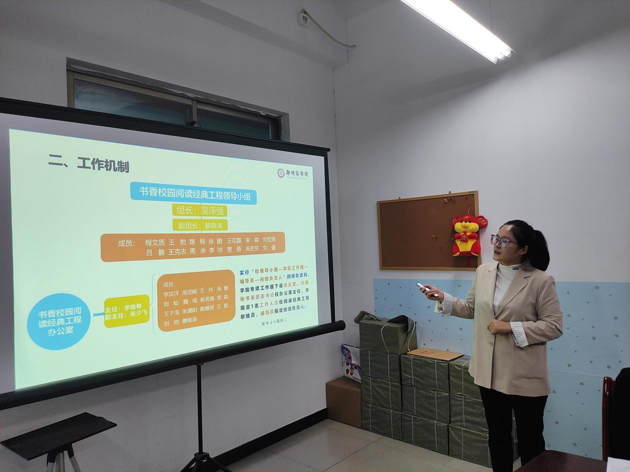 为持续推进“书香校园”阅读经典工程落地落实,引导学生开展经典阅读、深度阅读,促进学生的全面发展,养成终身阅读的习惯,10月24日下午,管理学院在2号教学楼一楼会议室组织开展“书香校园阅读经典工程”实施方案解读会,特邀请图书馆刘亚楠老师为管理学院全体辅导员解读《beat365唯一官网2020-2021学年书香经典阅读工程实施方案》。