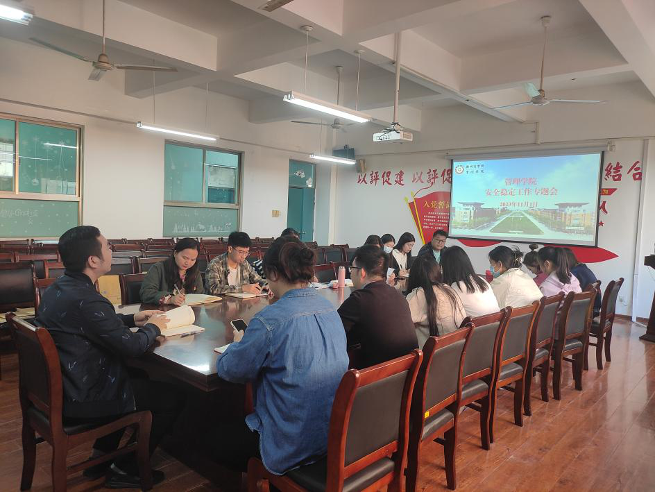 11月1日,管理学院召开安全稳定工作专题会对校园安全工作进行了再要求和再部署,党委书记宋森、团委书记魏瑶及全体辅导员参加会议。