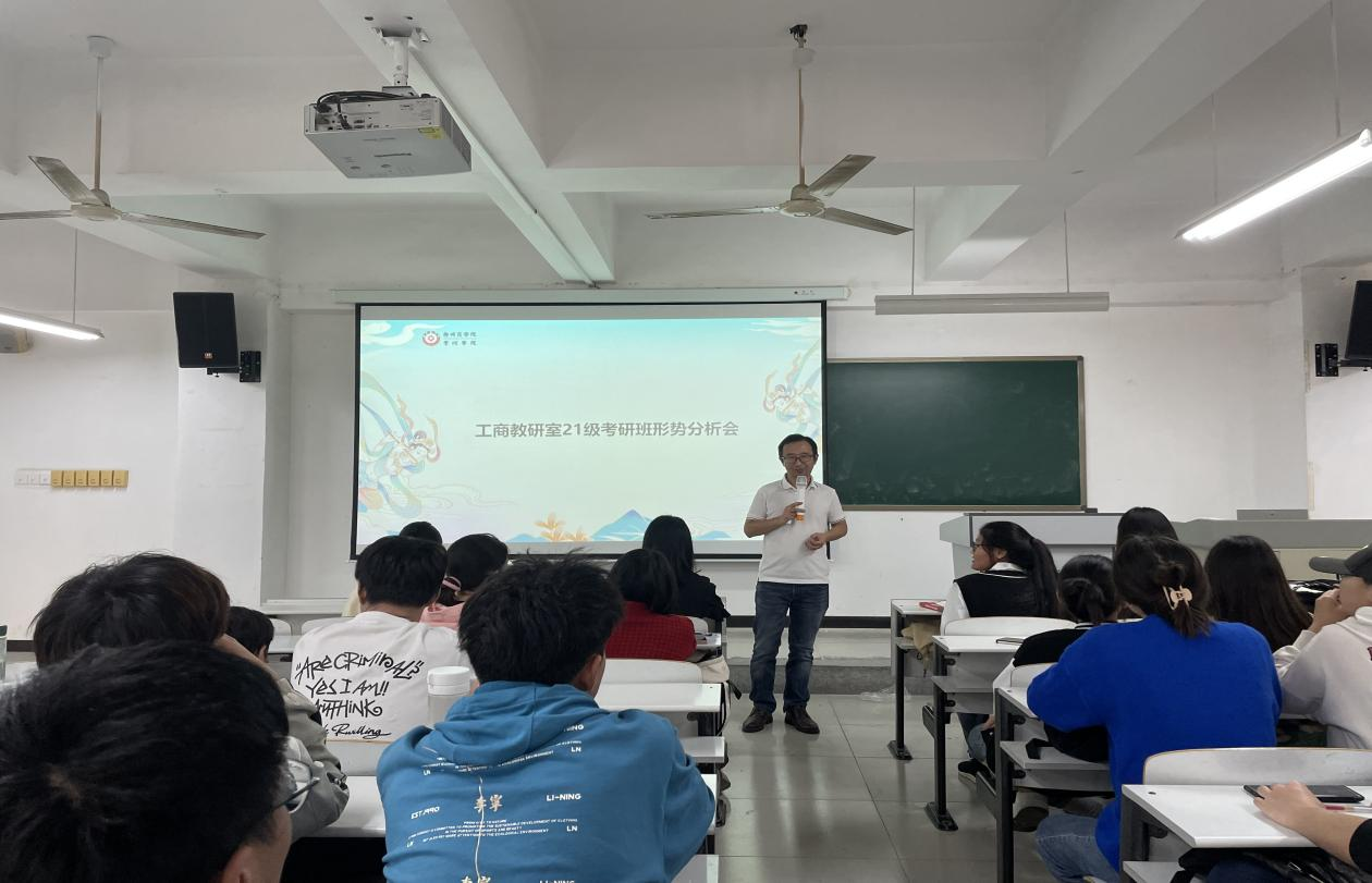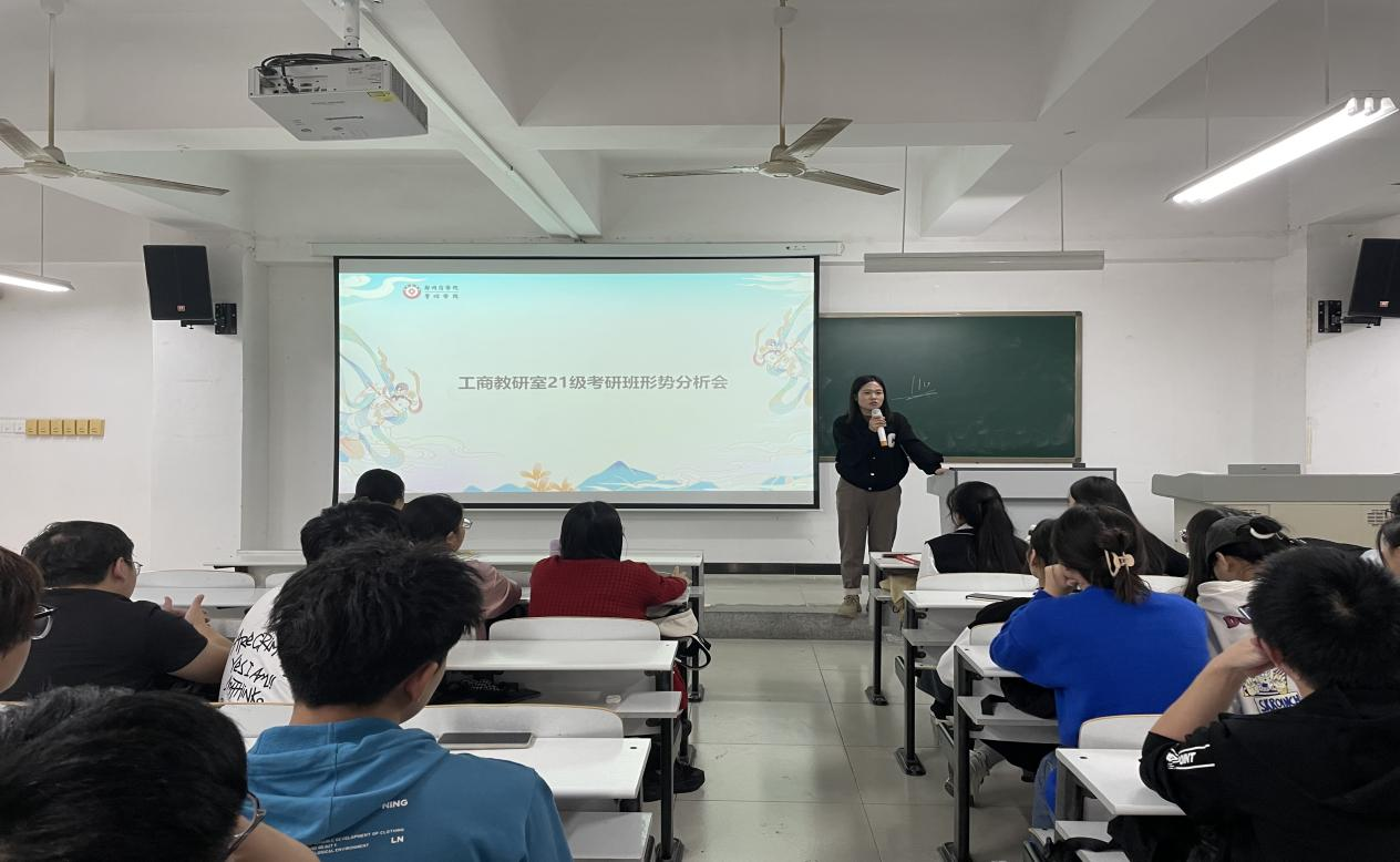 为了对近年来管理学院工商管理专业考研情况展开深入讨论,并引导2021级工商管理专业学生做好未来的学业发展规划,管理学院工商管理教研室于2023年10月31号下午5点在2301教室顺利召开2021级本科生考研分析指导会,工商管理教研室主任黄信恒、考研指导教师苗瑞洲、辅导员张勤英以及21级工商管理专业考研全体学生参加会议。