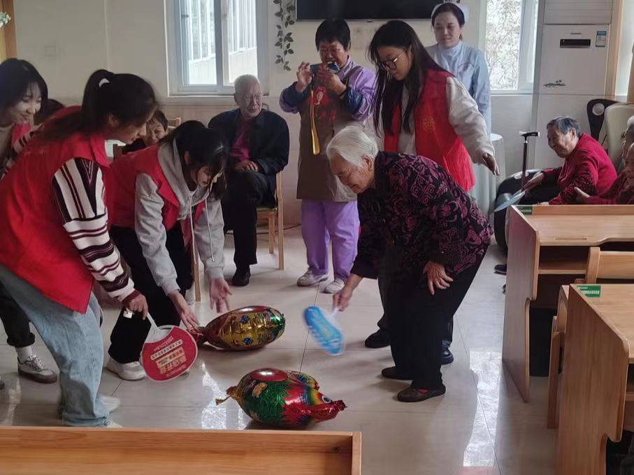 随后,志愿者们还带领老人参加了一些娱乐活动,活动现场的老人们表现出极高的热情,你与我比赛投壶,我为你加油助威,整个娱乐活动区洋溢着谈笑声、欢呼声,气氛热烈而融洽。