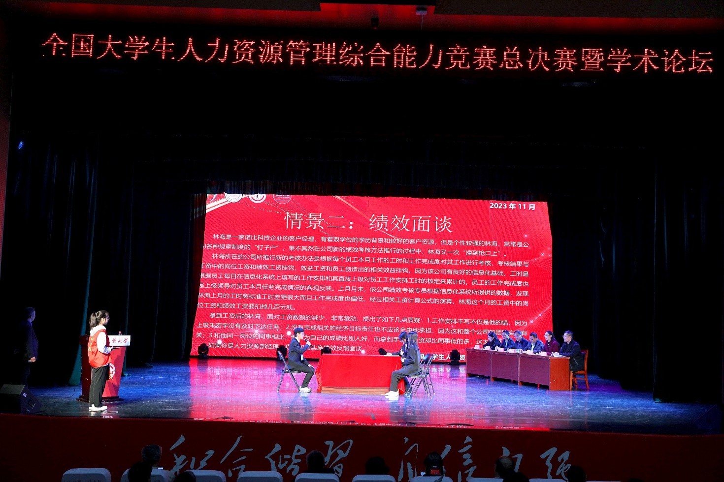 总决赛采取“HR模拟经营”和“HR职业实战”相结合的方式进行。各参赛队伍组建不同的公司,基于同一案例背景下,通过《人力资源管理智能仿真与竞赛对抗平台》软件操作进行对抗竞争。通过对软件内置的人力资源规划、工作分析中心、招聘与甄选中心、培训与开发中心、绩效管理中心、薪酬管理中心、员工关系管理中心、产品中心八个模块的操作,实现人力资本投资回报率和人力价值的提升,使学生的专业知识得以灵活运用,人资技能得以提升。“HR模拟经营”环节过后进入“HR职业实战”环节,参赛队伍围绕赛前组委会公布的主题和框架,结合人力资源管理专业知识,对人力资源人员招聘、劳动争议、绩效反馈面谈等核心职业情景进行分析设计,并通过团队角色扮演的方式进行演绎。