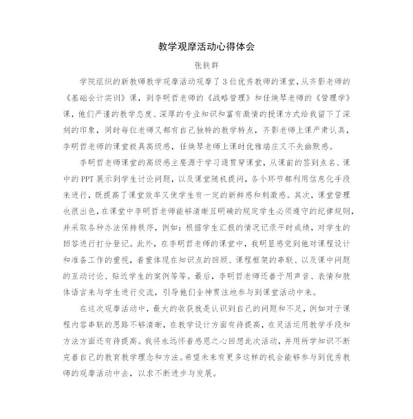 见贤思齐,学思共进。在总结学习阶段,新教师们认真撰写了此次教学观摩活动的心得体会,总结了在观摩过程中学习到的教学技巧和方法,反思了自身在课堂教学中存在的不足,明确了今后的改进措施,提出了作为一名新教师今后的发展目标和方向。
