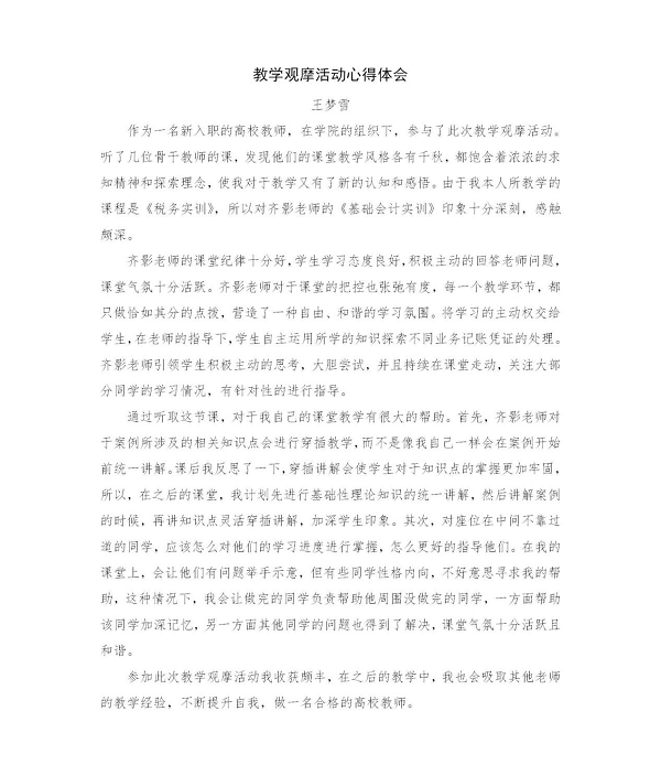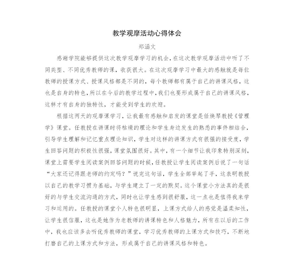 见贤思齐,学思共进。在总结学习阶段,新教师们认真撰写了此次教学观摩活动的心得体会,总结了在观摩过程中学习到的教学技巧和方法,反思了自身在课堂教学中存在的不足,明确了今后的改进措施,提出了作为一名新教师今后的发展目标和方向。