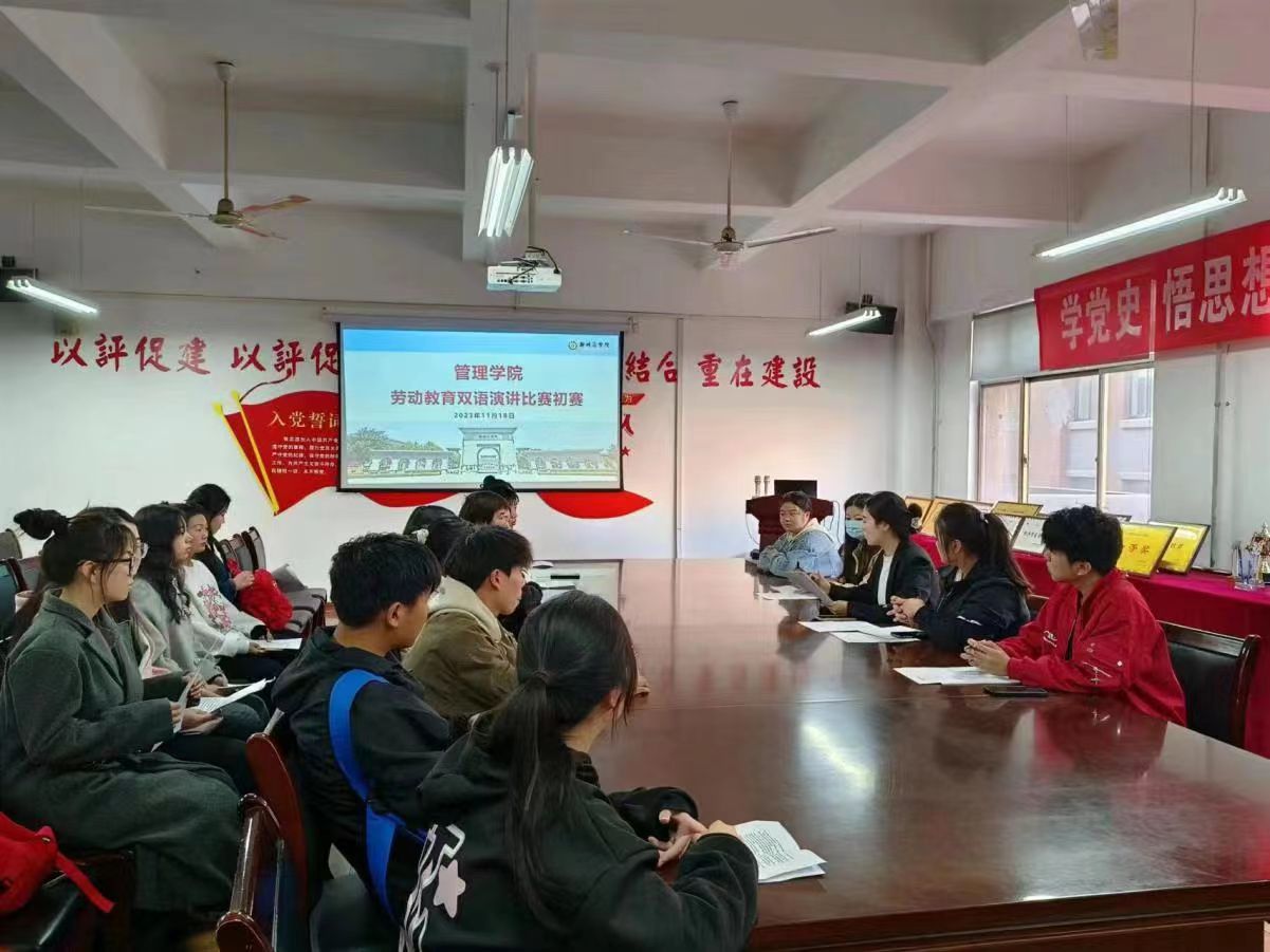 为了展现劳动之美,弘扬劳动精神,让我院学子主动学习劳动模范事迹,培养正确劳动价值观,11月18日下午,我院在2号楼206开展了管理学院劳动教育双语演讲比赛初赛。