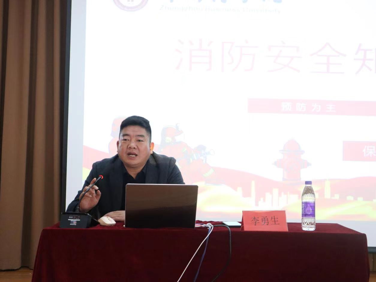 李勇生科长以“预防为主,生命至上”为主题,分别从学校火灾案例、学校消防安全特点、各个场所防火重点、消防设施的认识及使用、报警及逃生的方法进行讲解。火灾案例令人触目惊心,同学们也通过本次培训对校园内的消防安全有了进一步的认识,了解到火灾发生时的“四会”“三救原则”。“四会”即会使用消防器材、会报火警、会扑救初起火灾、会组织疏散逃生;“三救原则”即逃生时要防烟、把握方向、借助工具逃生。