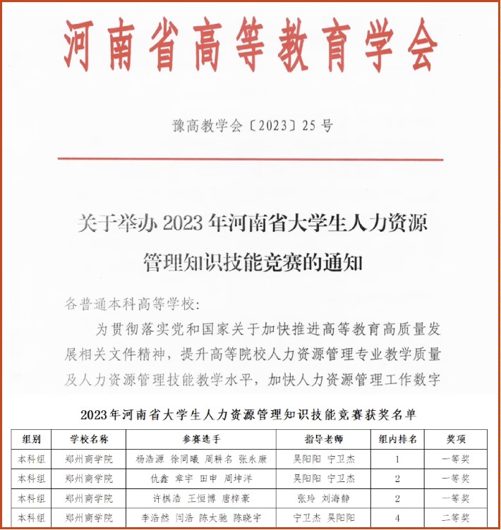 11月19日,由河南省高等教育学会主办、许昌学院承办的“2023年河南省大学生人力资源管理知识技能竞赛”(豫高教学会〔2023〕25号文件)以线上形式成功举办。本次大赛全省共45所高校、172支队伍、670余名选手同台竞技。我院工商管理专业学生组成的4支代表队,凭借扎实的专业知识和优秀的实操技能脱颖而出,取得1个小组第一名,2个小组第二名,1个小组第四名的优异成绩,荣获“2023年河南省大学生人力资源管理知识技能竞赛”一等奖3项、二等奖1项。