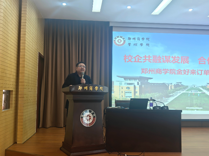 管理学院院长杨松柏回顾了与河南金好来公司合作历程,向同学们介绍了历届金好来订单班培养情况,并结合当下经济形势分析未来的就业形势,阐述了订单班在应用型人才培养中的重要性,希望同学们能够珍惜学习机会,在实践工作岗位上有所收获。同时杨院长也表达了希望与金好来公司建立长效合作机制、实现优势互补,促进学院人才培养模式的创新与发展。
