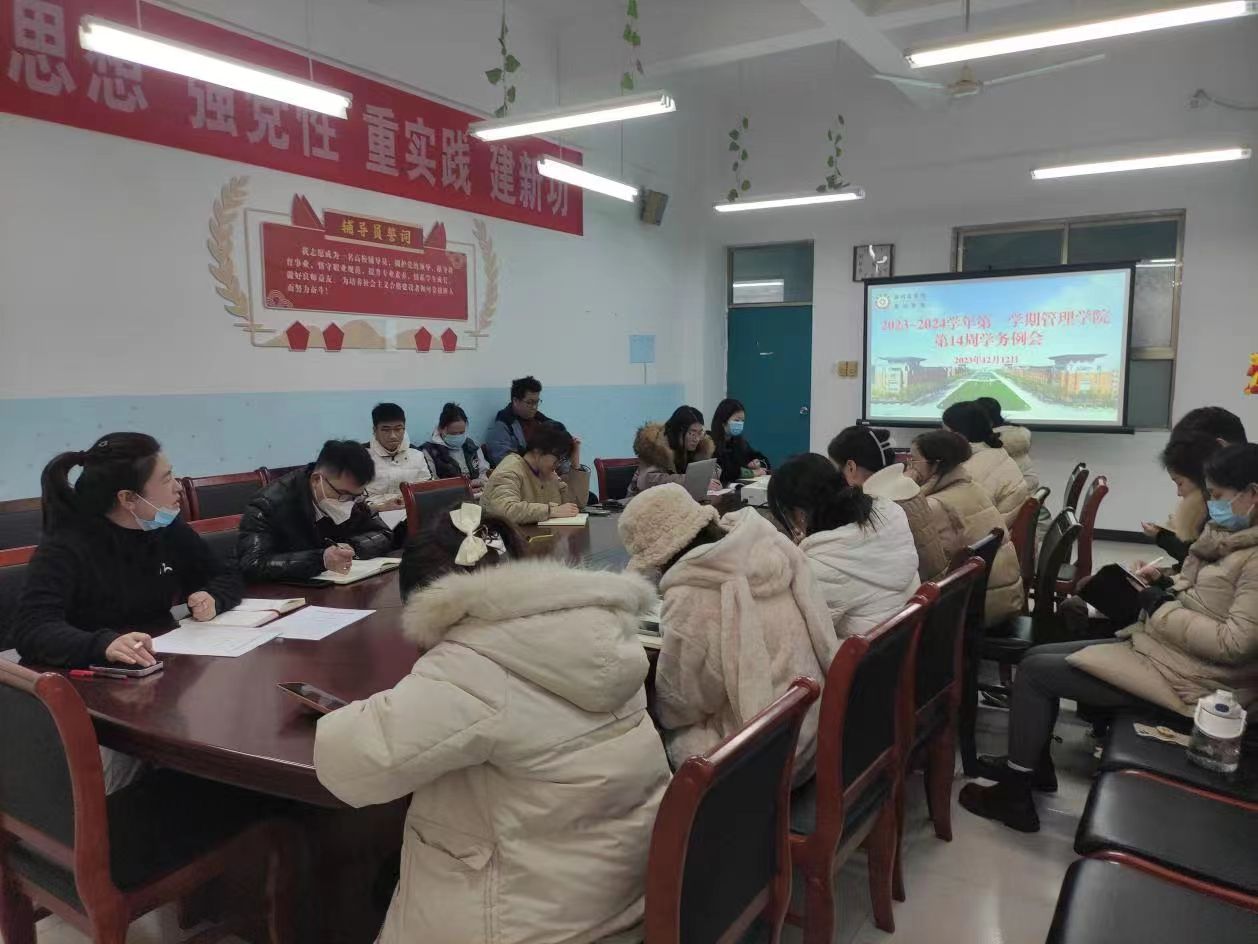 12月12日,管理学院在2号楼一楼会议室召开第14周学务例会,管理学院团委书记魏瑶及全体辅导员老师参加会议。