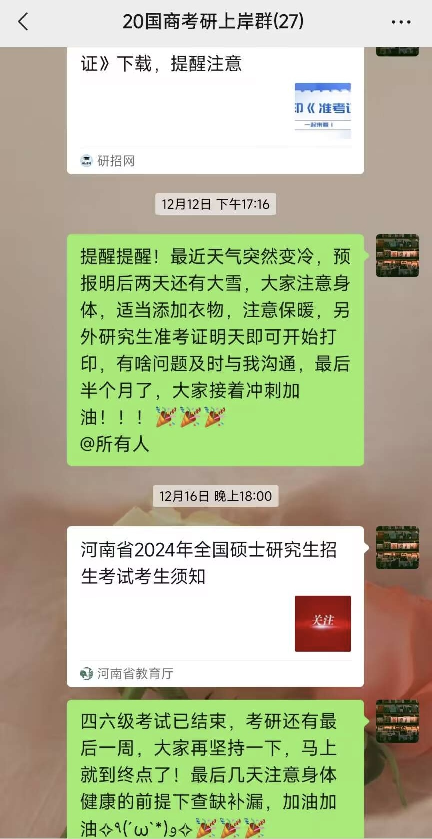 2024年全国硕士研究生招生考试即将到来,为帮助考研学子坚定考研信心、缓解备考压力,管理学院在坚持不打扰学生自主复习的原则下,为考研学子在最后关键时期提供雪中送炭般的指导与关怀。