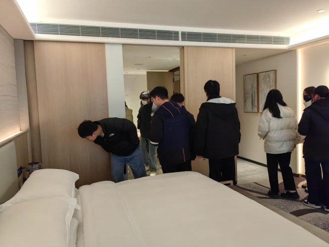 随后,酒店人力资源部姚婉路经理、前厅部陈玲果经理、人事高亚昀主管、安保吴立业主管带领同学们参观酒店各个职能部门,包括前厅部、客房部、餐饮部、酒店大堂、总统套房、行政套房、多功能宴会厅、员工生活区等,让学生了解职场环境、感受企业文化、认识企业工作流程,对酒店行业形成初步了解。