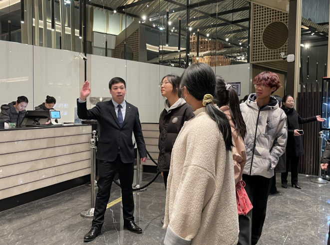 随后,酒店人力资源部姚婉路经理、前厅部陈玲果经理、人事高亚昀主管、安保吴立业主管带领同学们参观酒店各个职能部门,包括前厅部、客房部、餐饮部、酒店大堂、总统套房、行政套房、多功能宴会厅、员工生活区等,让学生了解职场环境、感受企业文化、认识企业工作流程,对酒店行业形成初步了解。