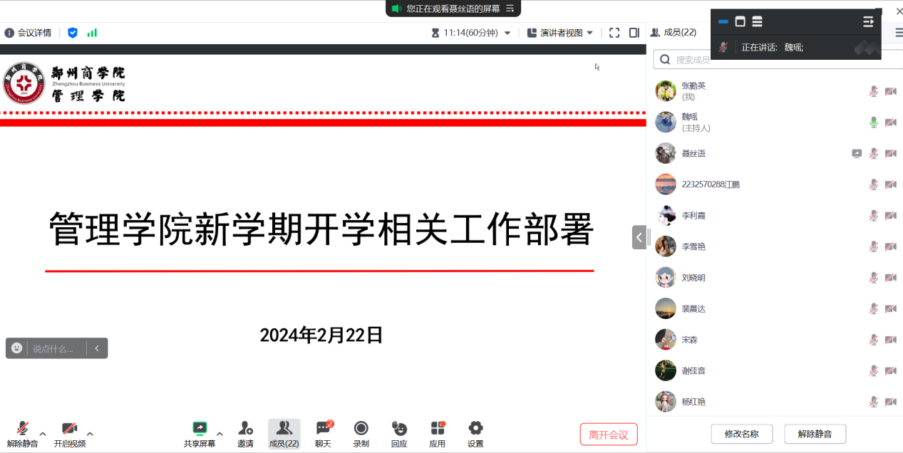 为做好新学期各项工作部署,开好局,起好步,共聚新力量,共谋新发展,共赴新征程,2月22日下午,我院在腾讯会议召开新学期收心暨工作部署会。我院党委书记宋森、团委书记魏瑶及全体辅导员参加会议。