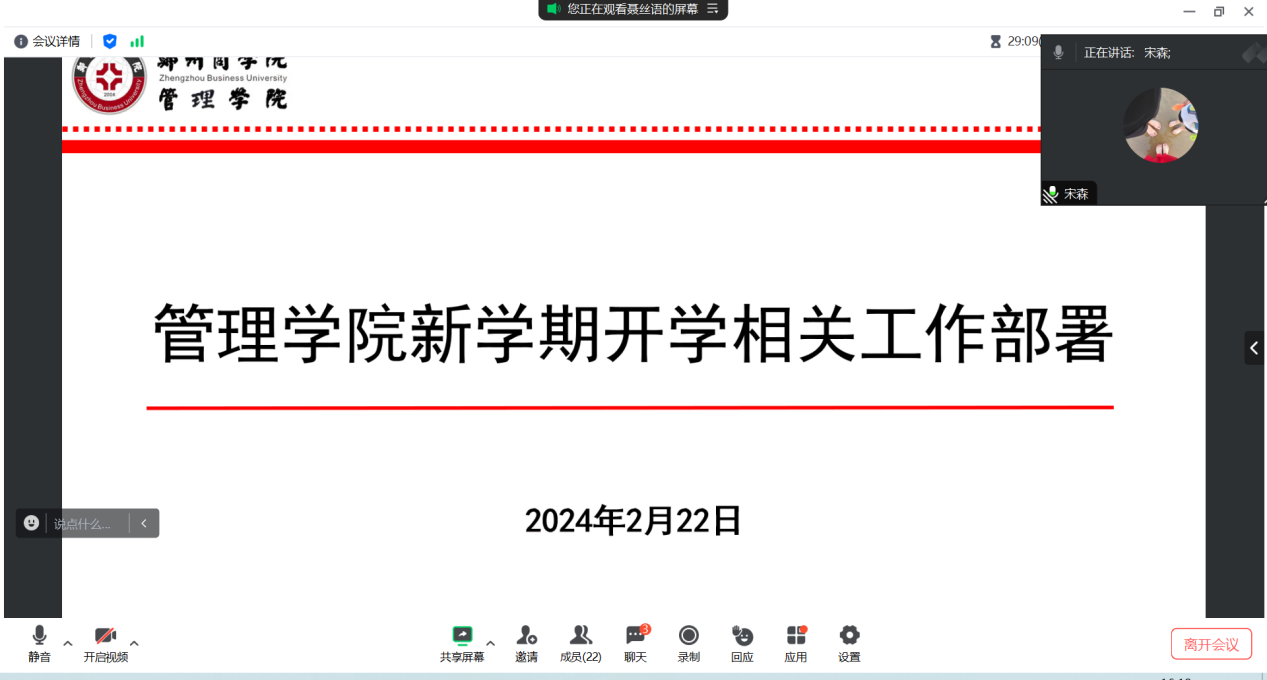 为做好新学期各项工作部署,开好局,起好步,共聚新力量,共谋新发展,共赴新征程,2月22日下午,我院在腾讯会议召开新学期收心暨工作部署会。我院党委书记宋森、团委书记魏瑶及全体辅导员参加会议。