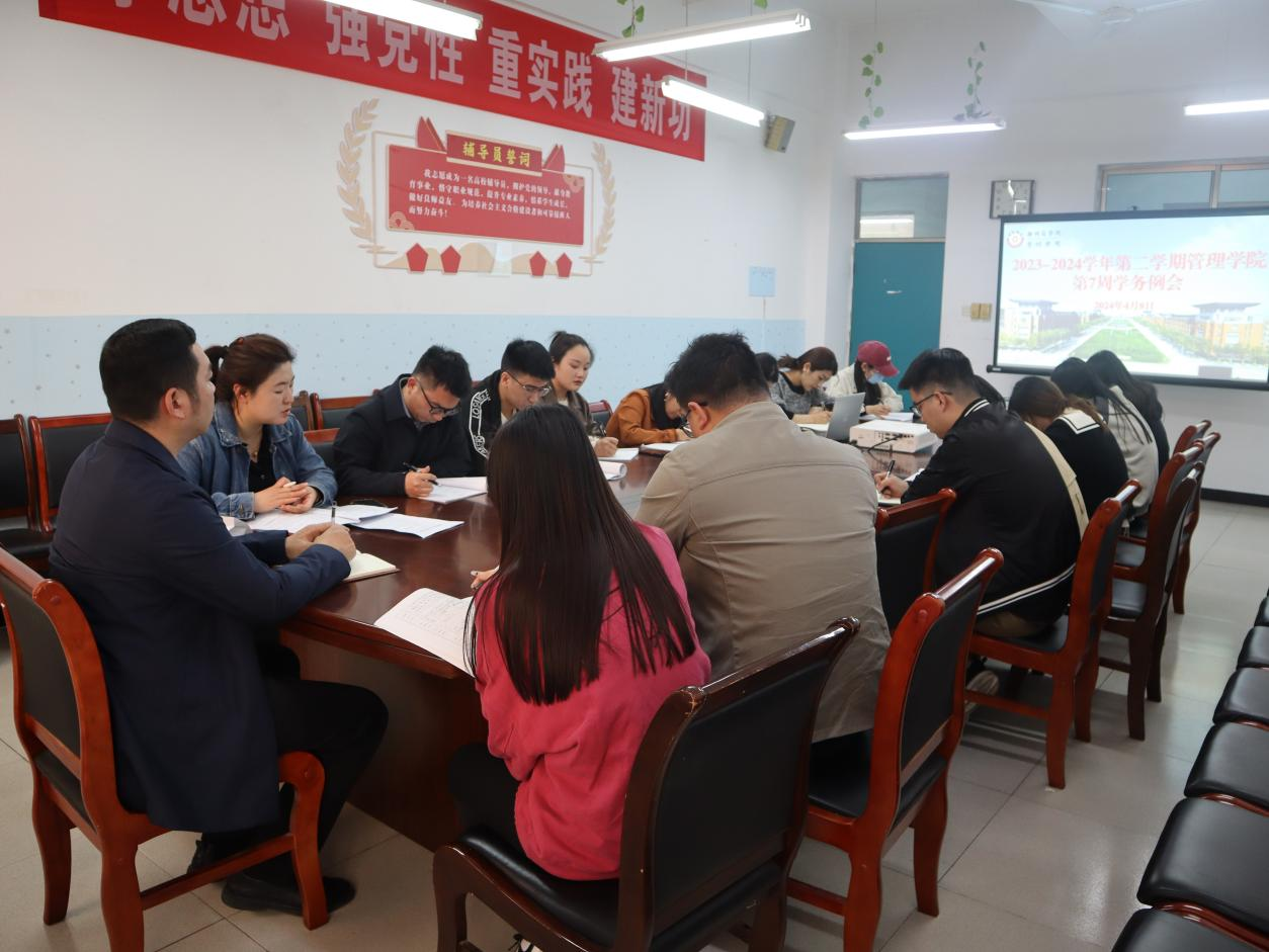 4月8日下午,我院在2号楼一楼会议室组织召开2023-2024学年第二学期第七周学务例会。我院党委书记宋森、团委书记魏瑶及全体辅导员参会。会上传达了本周学务例会精神及相关工作安排。