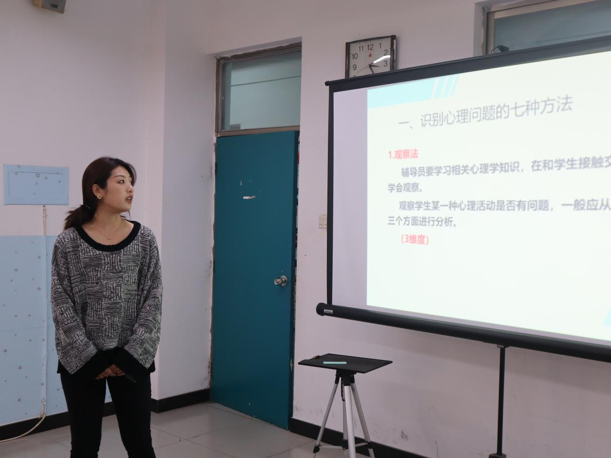 刘老师分享了心理问题的识别及常见心理问题的分类,主要围绕如何敏锐识别学生的心理问题及心理危机干预案例进行了细致的说明,提醒辅导员老师大学生心理问题逐渐常态化,要多给学生强调关注自身及身边同学心理健康,并全方位关注心理问题学生,规避出现自伤自杀危险。辅导员应合理有效利用心理约谈,关心爱护学生,走进学生内心。