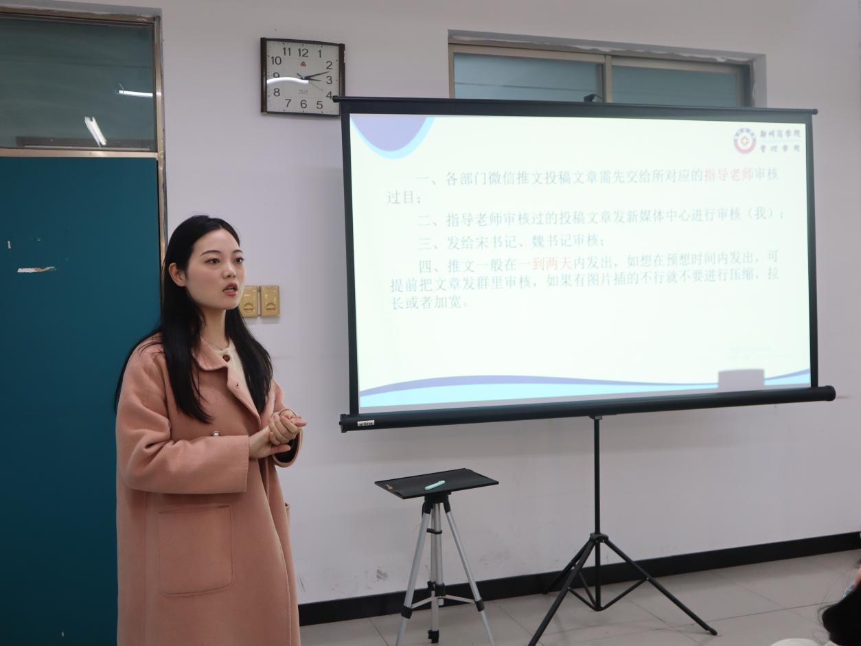 随后,开展第三期“润心讲堂”,由张勤英、刘晓明老师两位老师主讲。张老师通过“投稿流程、要求、格式和常见问题分析”四个方面,结合实际案例,深入阐述了校园新闻写作的规范形式、编写技巧等。本次新闻宣传业务培训,进一步推进了学院宣传思想文化工作,加强了我院全体辅导员新闻宣传的专业素养能力,努力把学院的正能量传递出去,把学院的好故事传播出去。