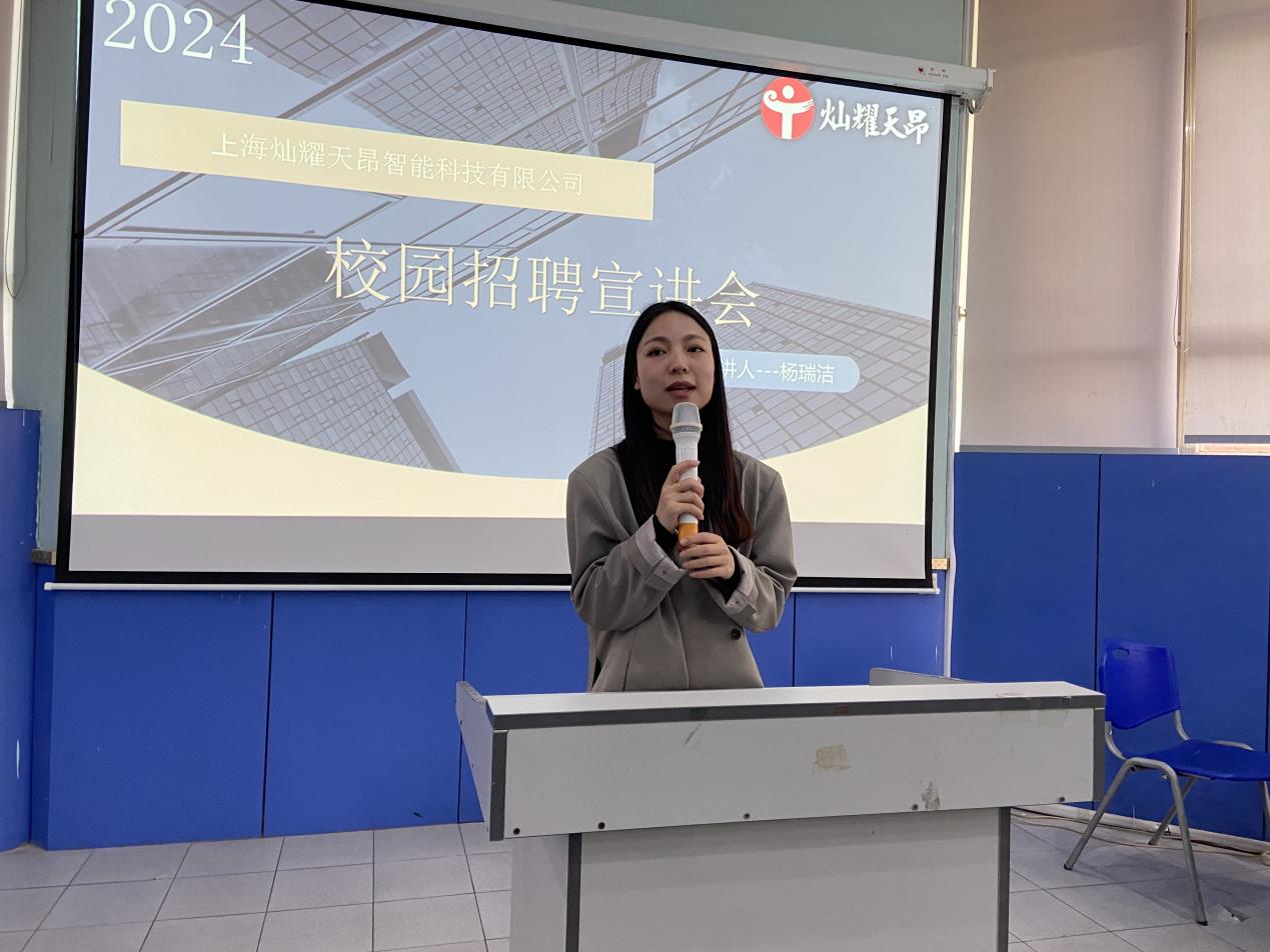 为贯彻落实党中央、国务院关于高校毕业生就业工作的决策部署,持续推进我院就业工作和校企交流合作,拓宽毕业生就业渠道,为毕业生开拓更多就业岗位,4月15日,上海灿耀天昂有限公司招聘负责人于2116给同学开展就业宣讲会。