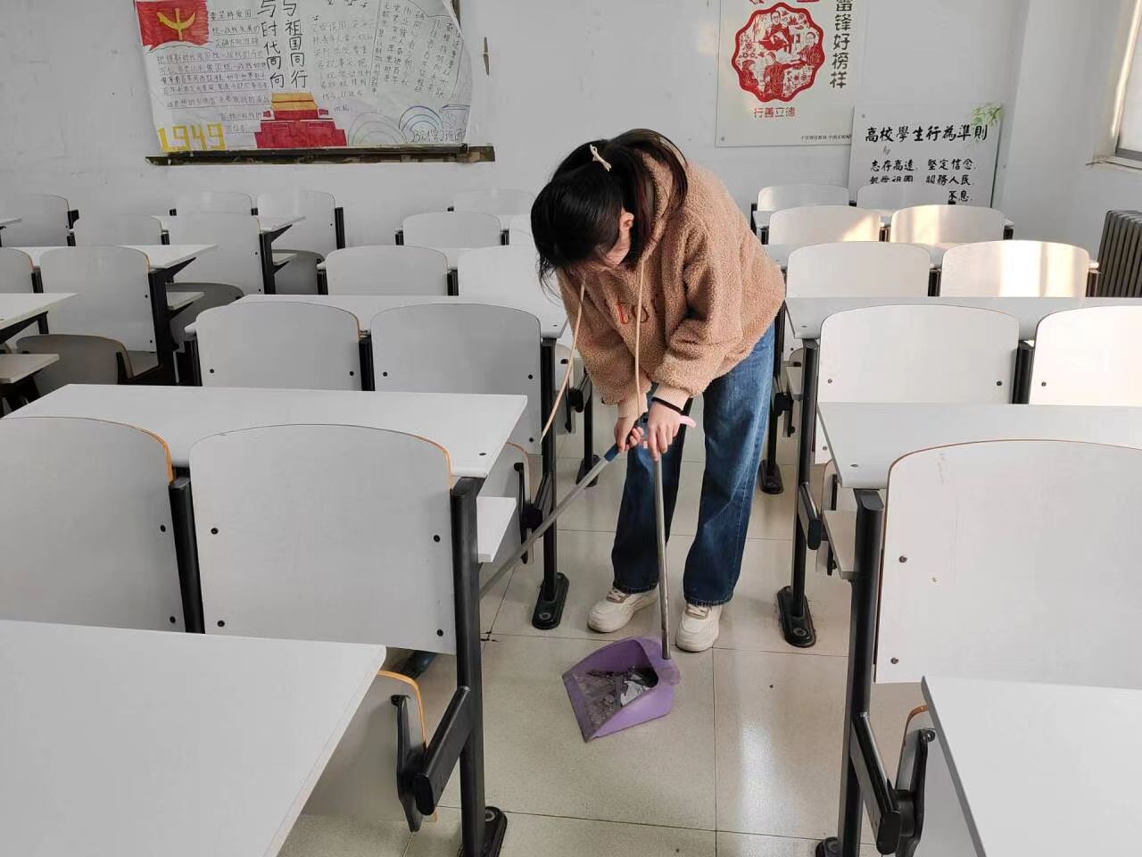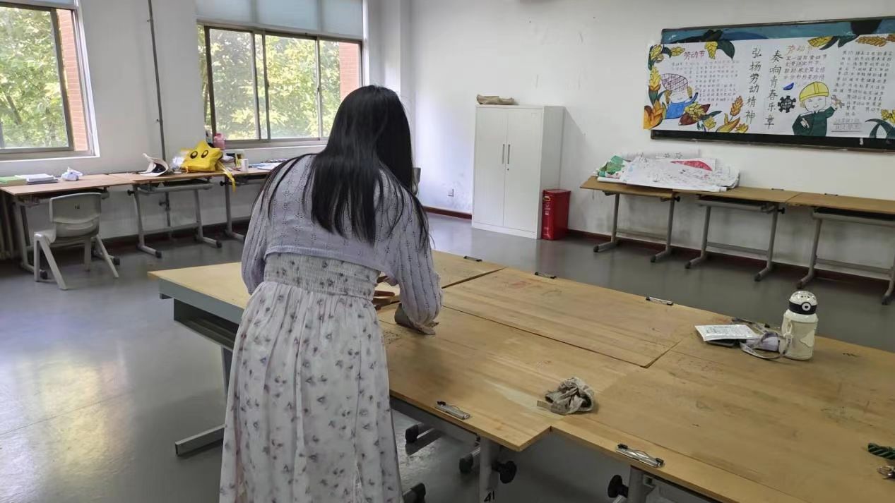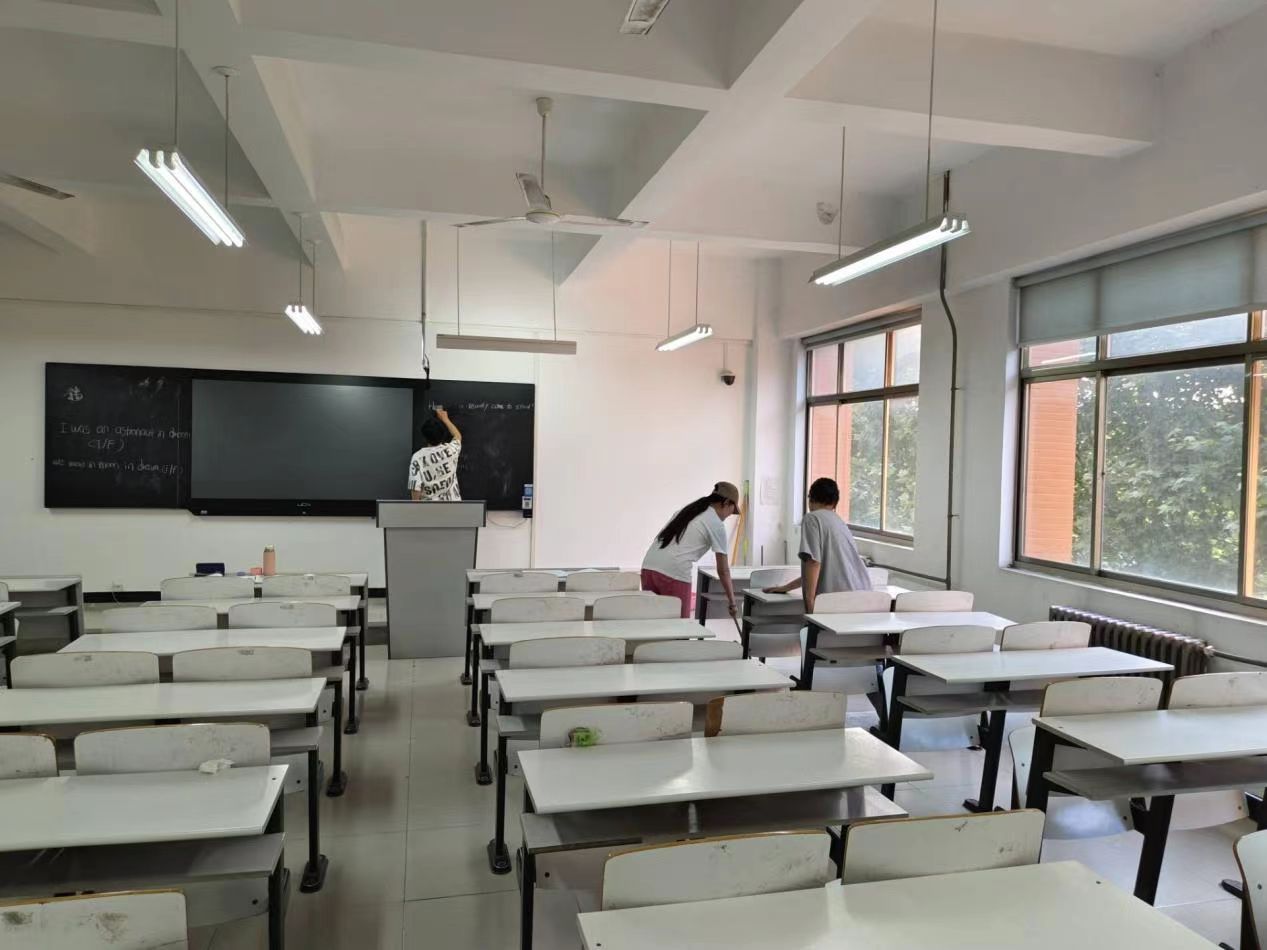 活动过程中,我院学子积极投入到教室卫生清扫的热潮中,认真清理教室的每一个角落。在同学们的相互配合下,清扫工作有序开展起来。他们用扫把扫去教室里的灰尘,用抹布擦去黑板上的字迹,针对死角的零散垃圾、纸屑等进行全方位清洁,在打扫过程中,充分发挥了不怕苦、不怕累的精神,用实际行动展现了“劳动最光荣”的传统美德。