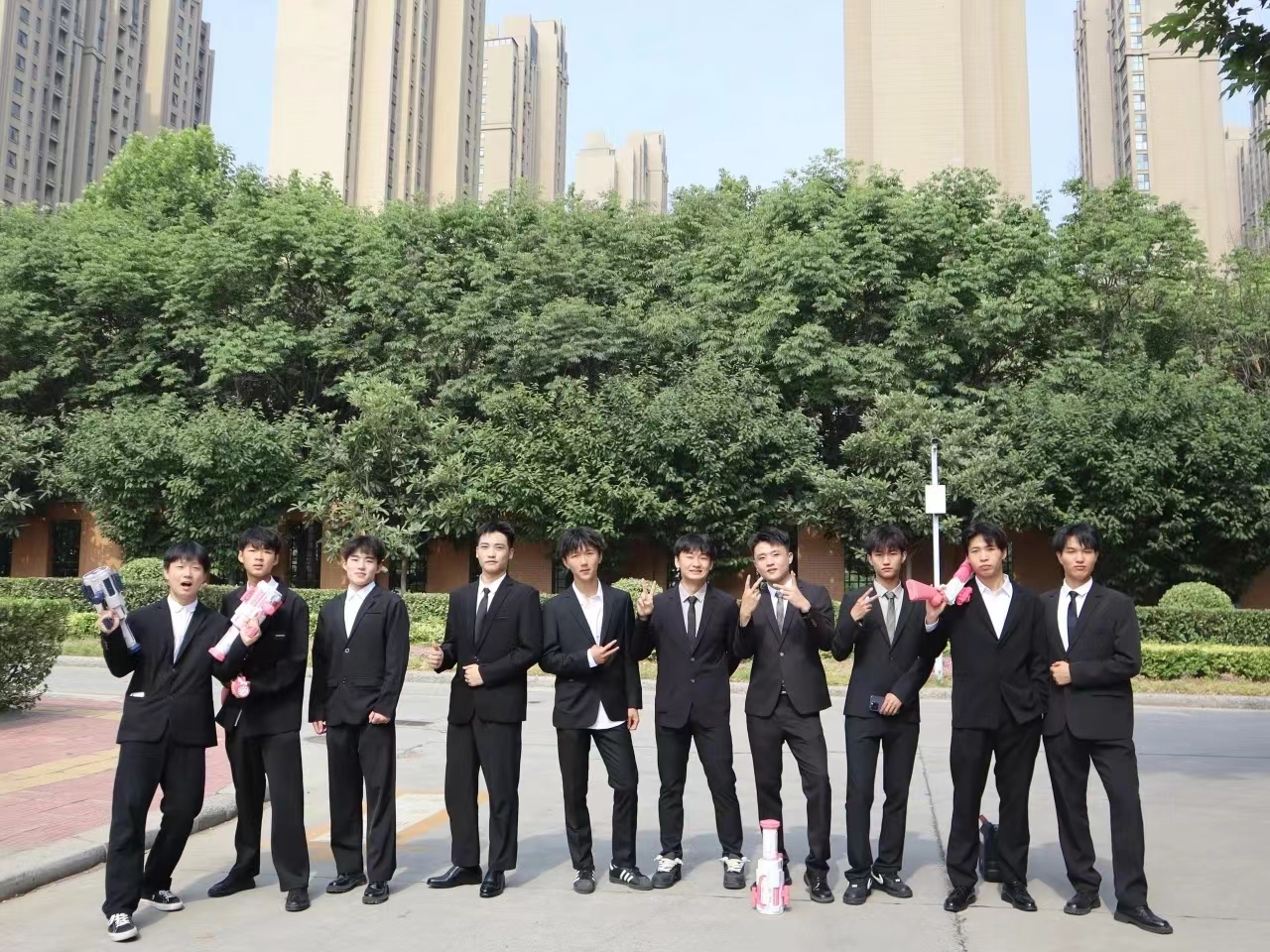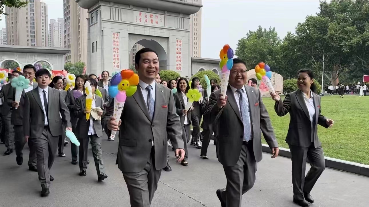 教师方阵、考研学生成功上岸方阵、优秀毕业生代表方阵从成功大道出发,依次前进。教师方阵的每位教师都手持手持风车和花朵气球,代表着对毕业生“前途似锦,一路生花”的美好祝愿;考研同学手持KT板及气球,在KT板上标明着他们成功上岸的学校名称,希望他们的未来前程似锦、扬帆起航。