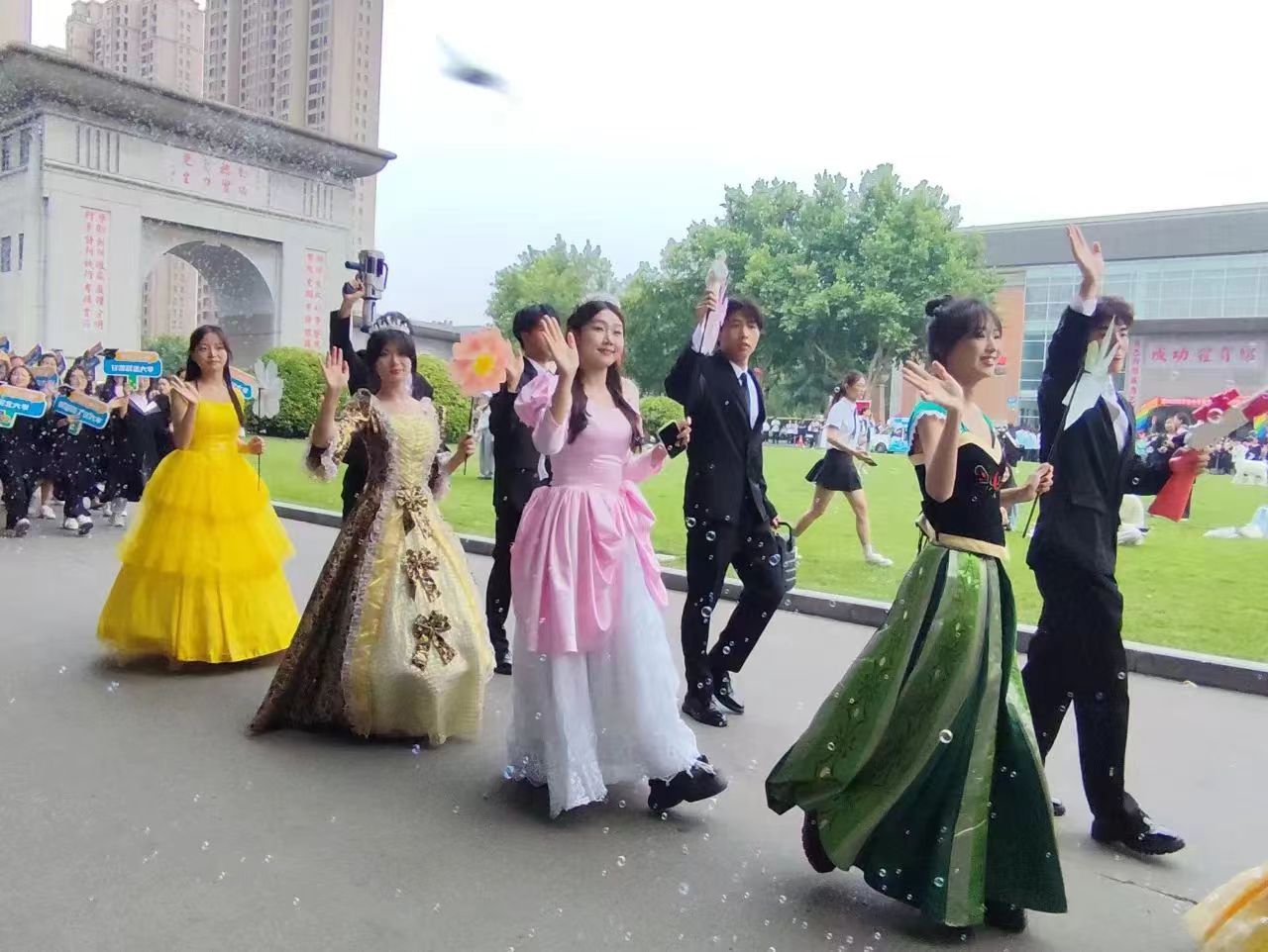 18位身着公主和王子礼服的同学在彩色泡泡的映衬下,行至行政楼前与校领导和现场的同学进行互动,分发气球。