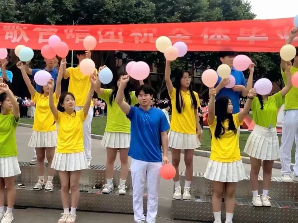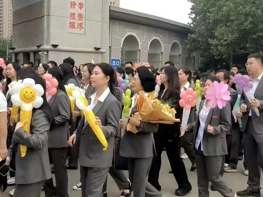 教师方阵、考研学生成功上岸方阵、优秀毕业生代表方阵从成功大道出发,依次前进。教师方阵的每位教师都手持手持风车和花朵气球,代表着对毕业生“前途似锦,一路生花”的美好祝愿;考研同学手持KT板及气球,在KT板上标明着他们成功上岸的学校名称,希望他们的未来前程似锦、扬帆起航。