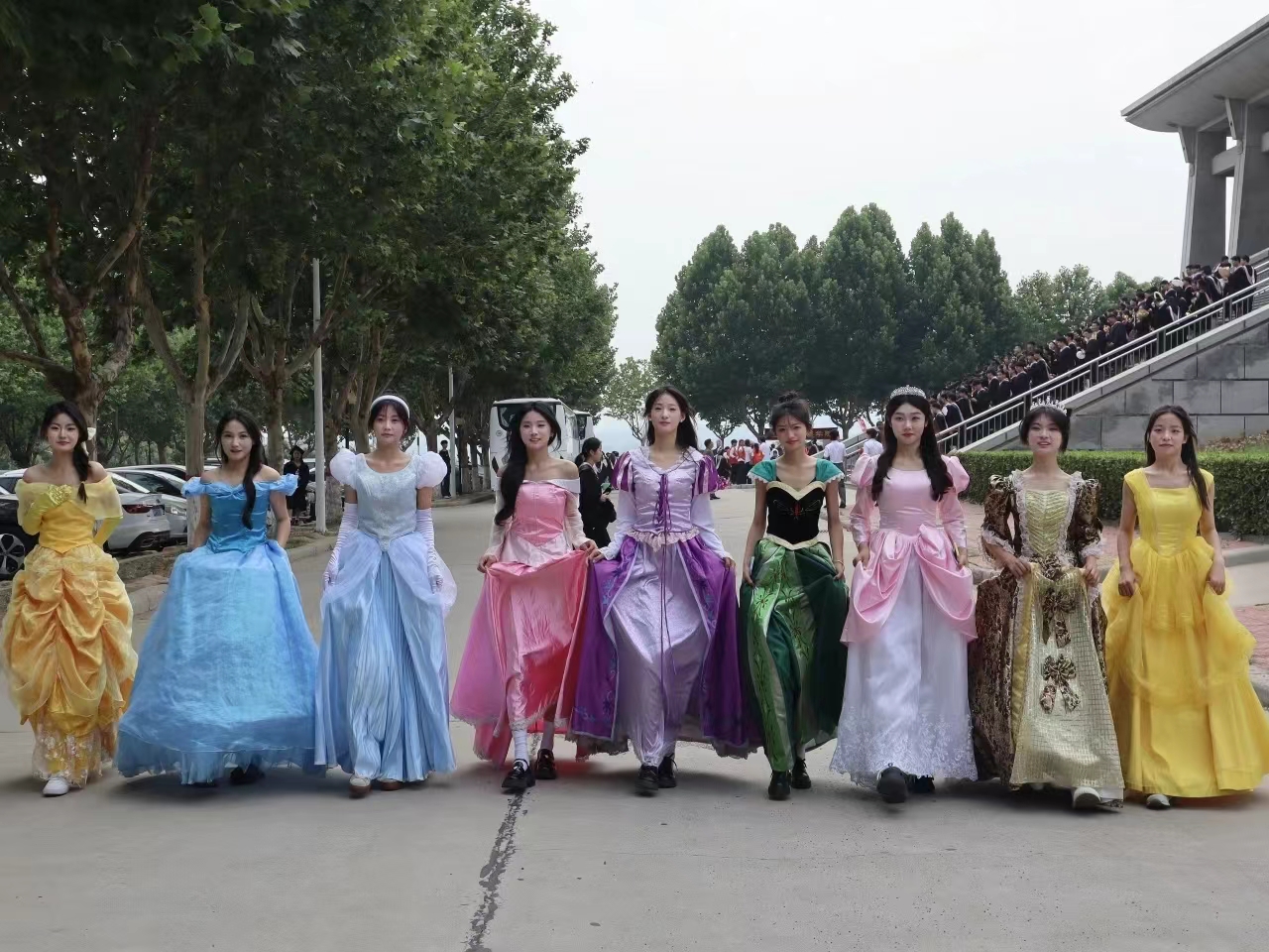 18位身着公主和王子礼服的同学在彩色泡泡的映衬下,行至行政楼前与校领导和现场的同学进行互动,分发气球。