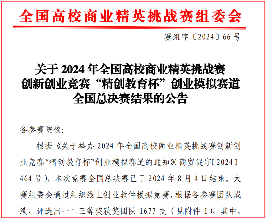 近日,由中国贸促会商业行业委员会、中国国际商会商业行业商会、中国商业经济学会主办的2024年全国高校商业精英挑战赛创新创业竞赛创业模拟赛道全国总决赛圆满落幕。经过知识赛、校赛、区域赛的激烈角逐,我院由工商管理专业和市场营销专业学生组成的五支代表队,在指导老师吴阳阳、宁卫杰、张玲燕、陈茜的带领下,取得国赛一等奖2项、二等奖1项、三等奖2项的优异成绩。