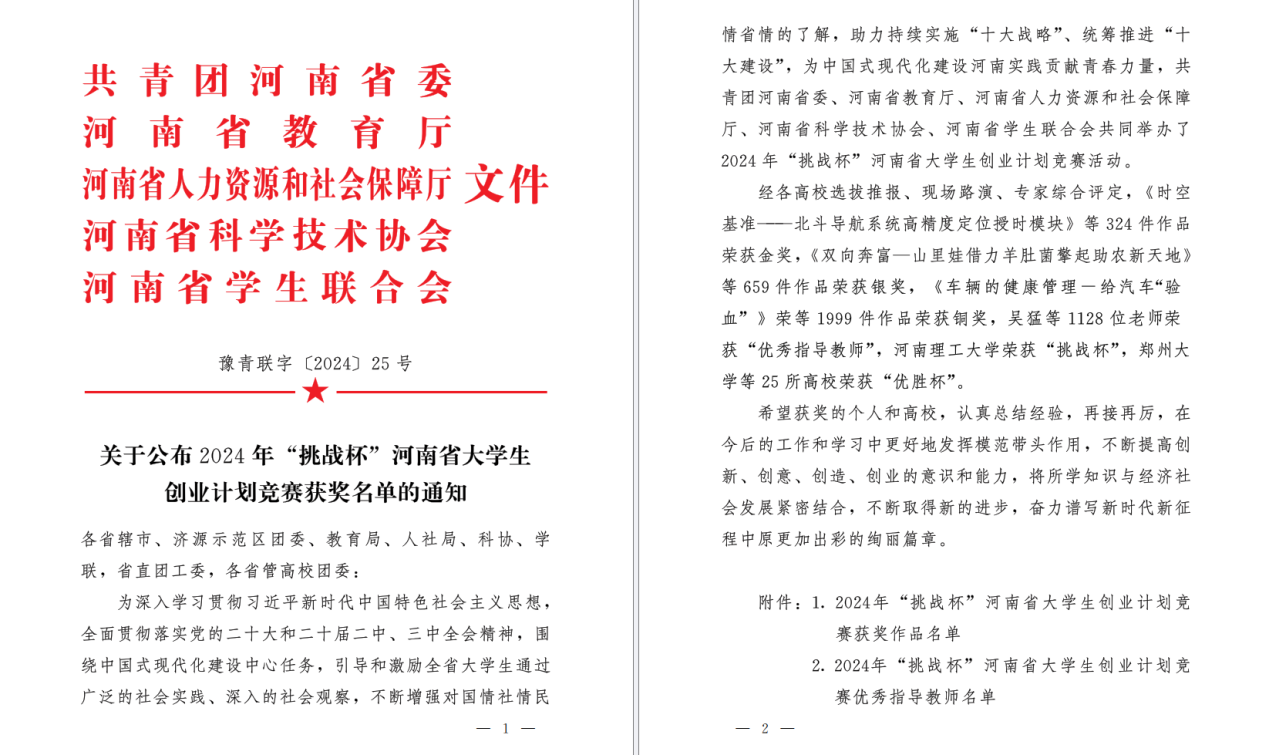 2024年“挑战杯”河南省大学生创业计划竞赛获奖名单
