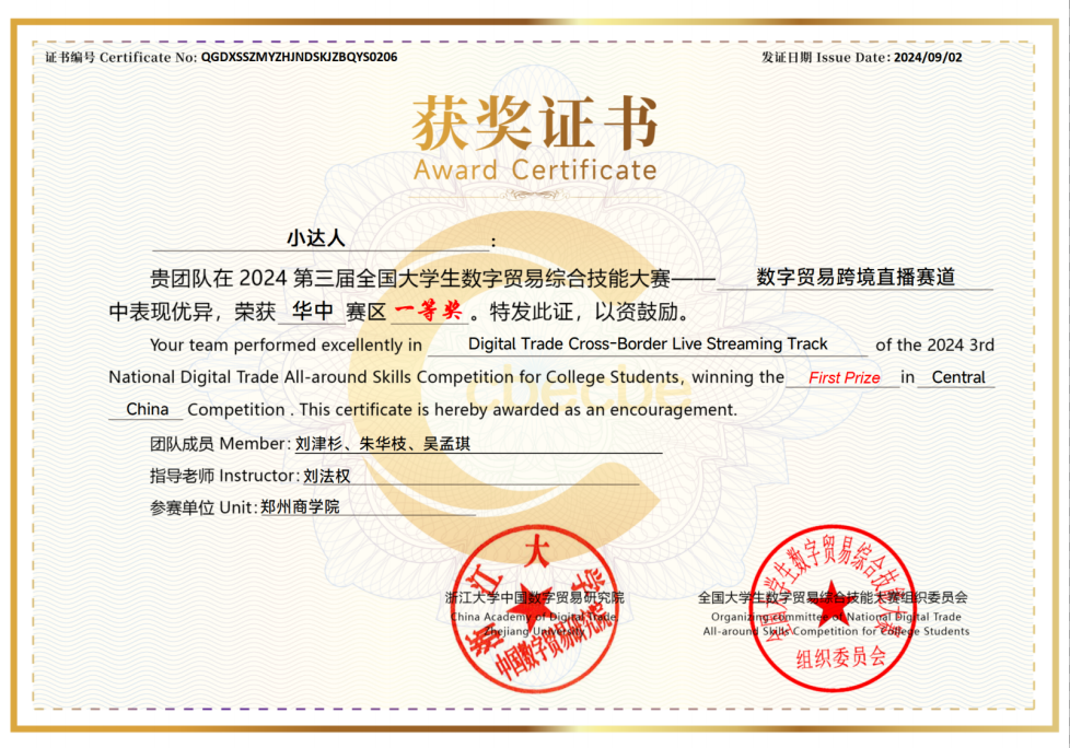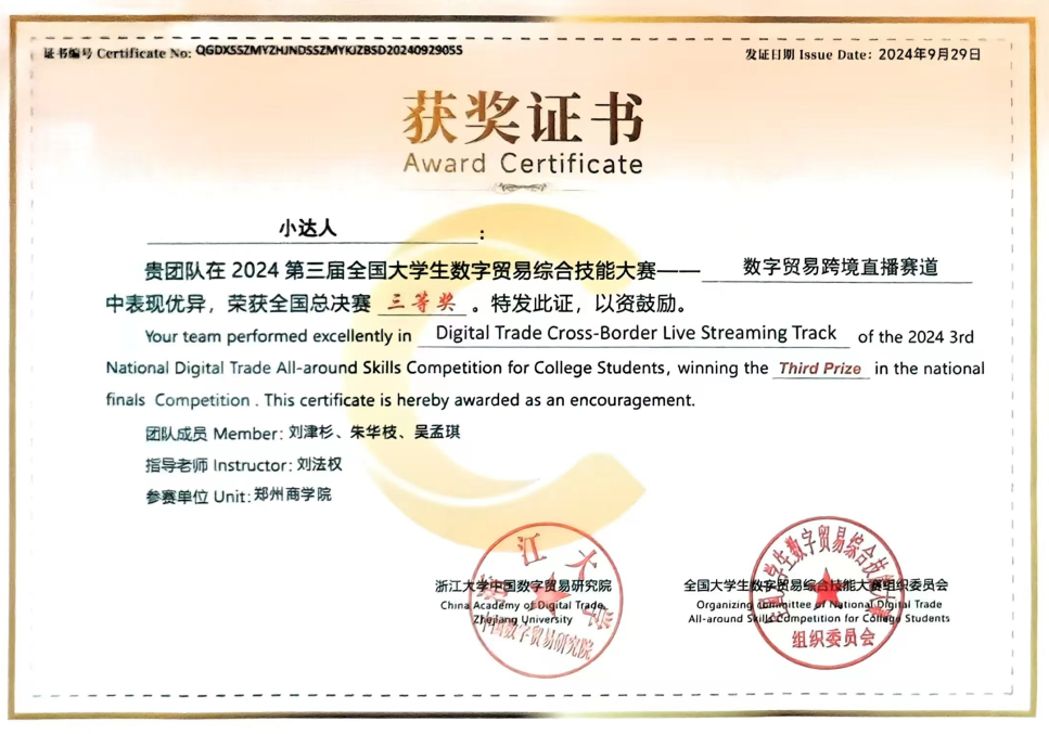 近日,由浙江大学中国数字贸易研究院主办,全国大学生数字贸易综合技能大赛组委会承办,与全球数字贸易博览会同步推出的第三届全国大学生数字贸易综合技能大赛圆满落幕。大赛共分为数字贸易创新创业、数字贸易大数据分析、数字贸易跨境直播、丝路电商来华留学生案例4个赛道,大赛分为初赛、区域赛和总决赛三个阶段。经过激励的角逐,beat365管理学院刘法权老师指导的小达人团队(刘津杉、朱华枝、吴孟琪)和326小分队团队(黄鸣浩、黄同乐、王豪淼、祝佳畅、赵淋瑞),分别在数字贸易创新创业赛道和数字贸易跨境直播赛道获得华中赛区第一名和第三名,其中小达人团队成功晋级全国总决赛,最终获得全国三等奖。
