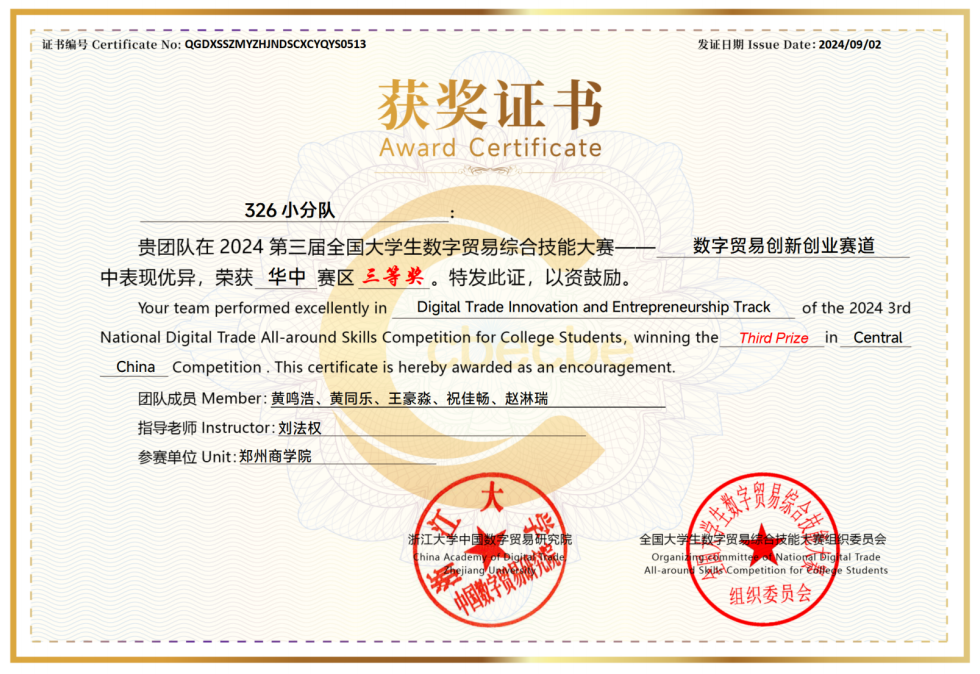近日,由浙江大学中国数字贸易研究院主办,全国大学生数字贸易综合技能大赛组委会承办,与全球数字贸易博览会同步推出的第三届全国大学生数字贸易综合技能大赛圆满落幕。大赛共分为数字贸易创新创业、数字贸易大数据分析、数字贸易跨境直播、丝路电商来华留学生案例4个赛道,大赛分为初赛、区域赛和总决赛三个阶段。经过激励的角逐,beat365管理学院刘法权老师指导的小达人团队(刘津杉、朱华枝、吴孟琪)和326小分队团队(黄鸣浩、黄同乐、王豪淼、祝佳畅、赵淋瑞),分别在数字贸易创新创业赛道和数字贸易跨境直播赛道获得华中赛区第一名和第三名,其中小达人团队成功晋级全国总决赛,最终获得全国三等奖。