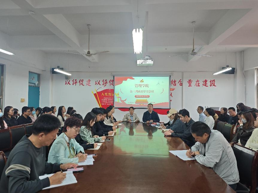 10月17日下午,管理学院在2号教学楼二楼会议室召开了2024-2025学年第一学期第7周政治学习专题会议,管理学院院长李晓翠,党委书记宋森,副院长张卫丽及全体教职工参加会议。会上,参会人员共同学习《习近平在全国教育大会上强调 紧紧围绕立德树人根本任务 朝着建成教育强国战略目标扎实迈进》,《中国教育报》评论(一、二、三)和《新一轮本科教育教学审核评估自评自建重点阐述及支撑材料目录(第二期)》。随后,大家又共同学习了“新时代高校教师职业行为十项准则”,并观看了有关师德师风问题的相关视频。
