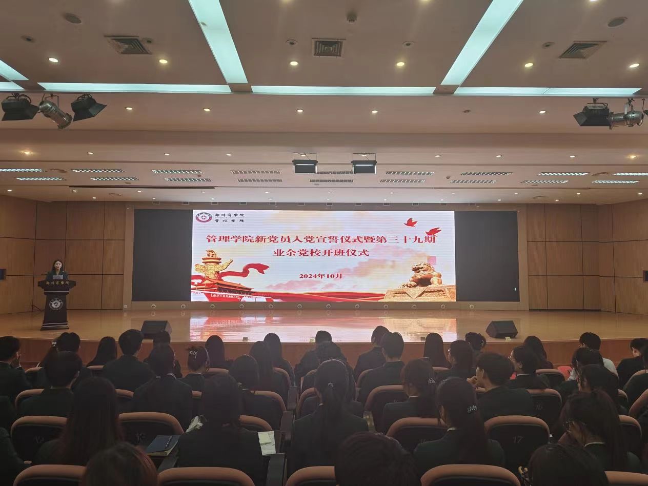 为进一步提高入党积极分子的思想政治素养和理论水平,引导广大青年学生积极向党组织靠拢,10月15日,我院于图书馆一楼报告厅举行新党员入党宣誓仪式暨第三十九期业余党校开班仪式。管理学院党委书记宋森同志、团委书记陈勇彬同志、各学生党支部书记、辅导员老师、管理学院新发展学生党员及第39期入党积极分子共同参加此次仪式。