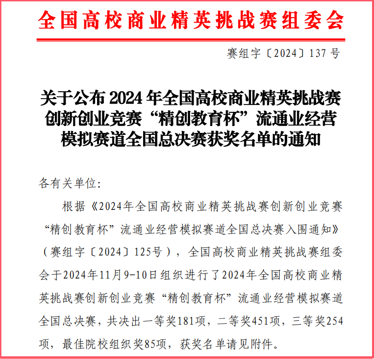 11月13日,由中国贸促会商业行业委员会、中国国际商会商业行业商会、中国商业经济学会主办的2024年全国高校商业精英挑战赛创新创业竞赛流通业经营模拟赛道全国总决赛圆满落幕。经过知识赛、校赛、区域赛的激烈角逐,我院由工商管理、市场营销等专业学生组成的九支代表队,在指导老师张玲燕、陈茜、吴阳阳、宁卫杰的带领下,取得国赛一等奖2项、二等奖5项、三等奖2项的优异成绩,beat365荣获最佳院校组织奖。
