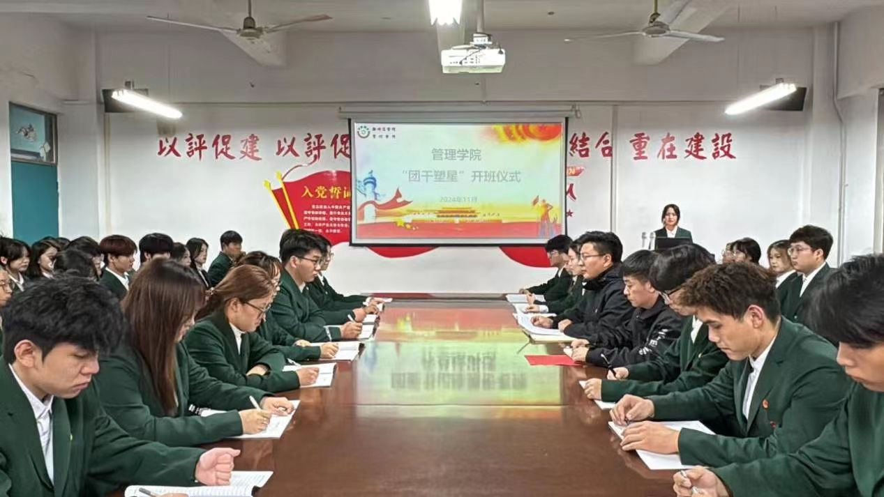 为加强我院学生干部队伍的建设,提升团学干部的综合素质,加强其凝聚力与向心力,11月18日晚,我院于二号教学楼206会议室开展“团干塑星”培训开班仪式暨第一讲培训会。本次开班仪式由王美琳同学主持,我院团委书记陈勇彬书记、辅导员代表李明哲老师、第十九届团委学生会主席团成员和各部门干部代表及2024级班长、团三委共同参加。