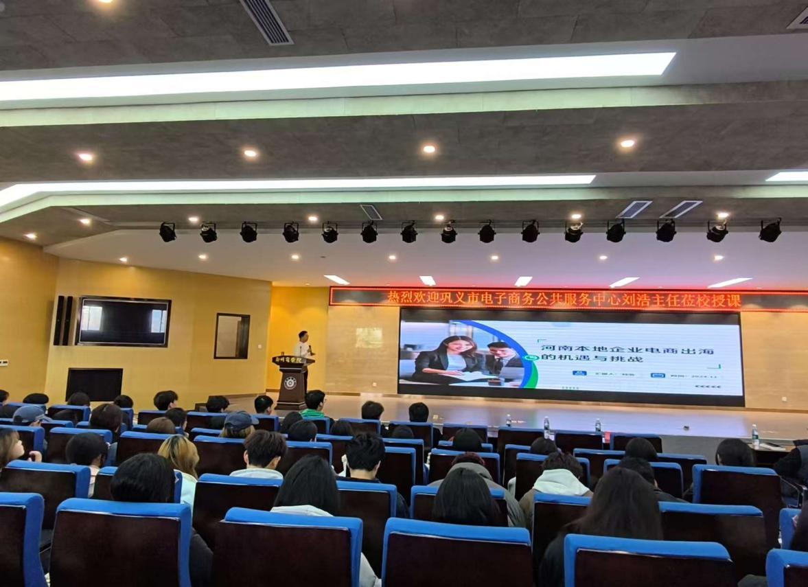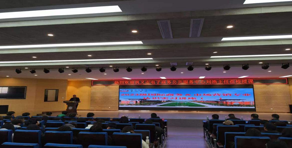为进一步强化学生对于行业的认知,丰富其职业岗位教育体验,依据专业人才培养计划安排,2024年11月25日下午,2023级国际商务专业与市场营销专业在自力大楼三楼报告厅联合举行认识实习第一场专题讲座。巩义市电子商务公共服务中心刘浩主任受邀作了《河南本土企业电商出海的机遇与挑战》专题报告,校督导吴现立教授、学院质监专员李明哲老师、国商教研室与营销教研室的教师代表以及 2023 级国际商务专业与市场营销专业全体学生参加了此次讲座,讲座由刘法权老师主持。