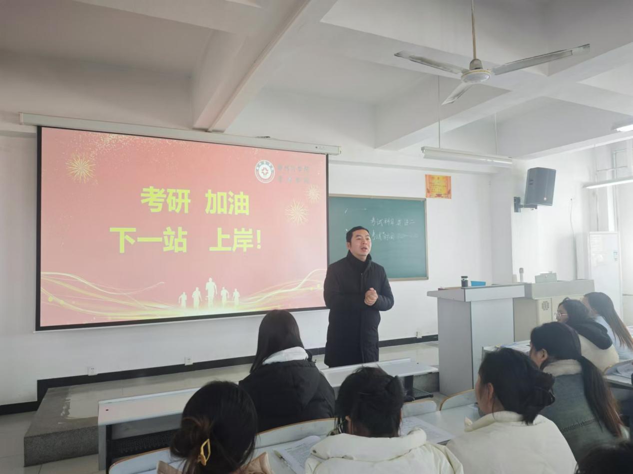 随后,院领导做冲刺动员讲话。宋森书记对考研学子刻苦学习、坚持不懈的学习态度给予肯定和表扬,激励同学们行好万里船,守好压舱石,坚定目标,劳逸结合,带着希望以最好的状态迎接考试!张卫丽副院长希望同学们能够保持稳定的心态、坚定的信心、高效的复习和健康的身体,坚持做到把握重点、攻克难点、消除疑点,最后考出理想成绩!