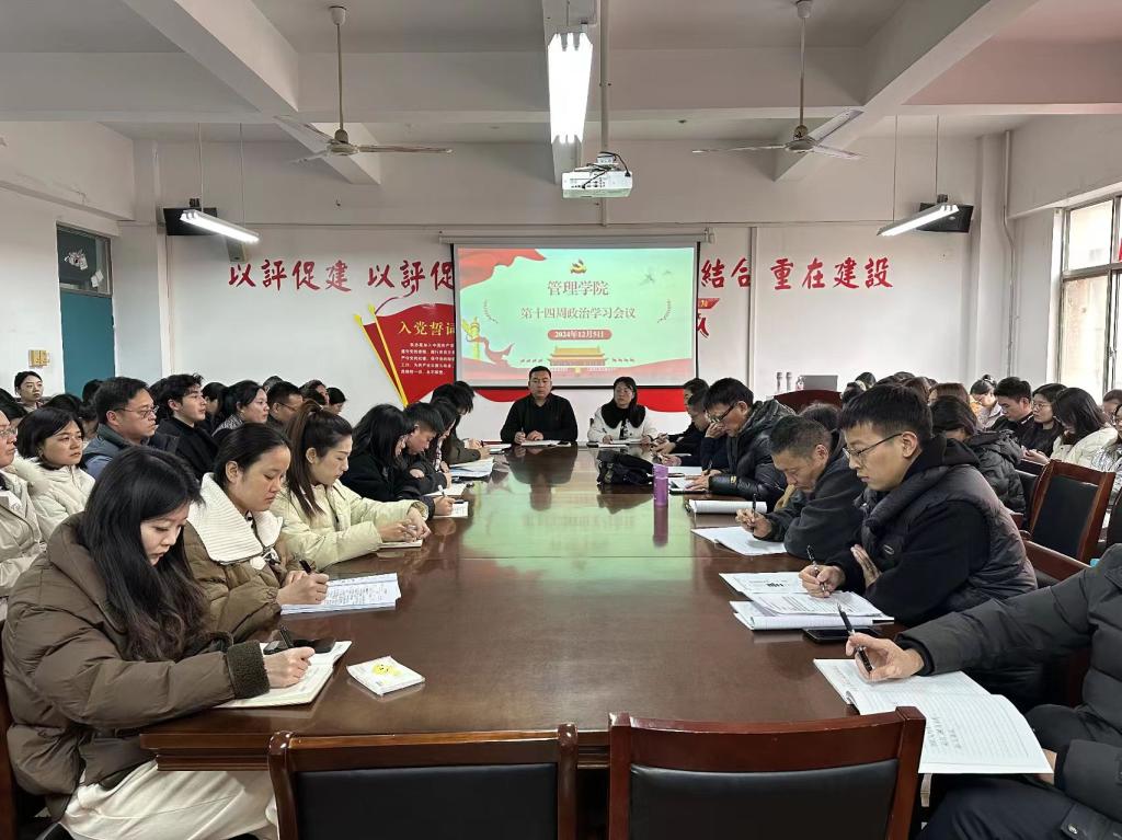 为深入习近平总书记关于关于宪法和坚持守正创新的重要论述,把握指标内涵要求,12月5日下午,管理学院在2号教学楼二楼会议室召开了2024-2025学年第一学期第14周政治学习专题会议。