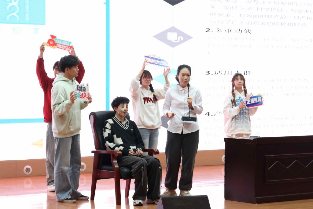 比赛环节,本次比赛围绕“青春数智,聚势We来”这一主题,由进入决赛的9支参赛队伍依次登台展示,在规定时间内运用模拟直播带货的形式分别介绍各自的产品。各参赛队伍精心准备,通过PPT及视频展示、歌舞表演、实物体验、观众互动等各具特色的表演方式和默契的团队协作,带来了美妆、洗衣液、太空船票、玩偶,以及电子产品等多样化的商品展示。成功点燃了现场观众的购买欲望,为观众带来了一场耳目一新的营销盛宴,现场掌声和欢呼声此起彼伏。同时,五位评委依据公平公正的原则,对各组参赛队伍的直播表现、产品介绍、创新创意、现场效果等多个方面进行评分,保证整场赛事的公平性、竞争性。