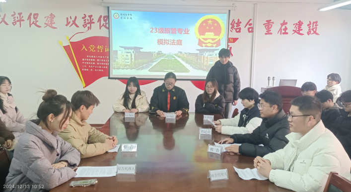23旅管1班的两组学生以《旅行社侵权案》、《电梯吸烟案》为案例故事,进行模拟庭审过程。学生们严格按照真实的庭审程序进行模拟审判,法官公正无私地主持审判,检察官指控有力,律师辩护精彩,被告人积极配合,整个庭审过程井然有序。庭审结束后,王彦青主任对活动进行了精彩点评,对学生们的表现给予了高度评价,并通过酒店案例分享,以案释法,引导学生们树立正确的人生价值观与行为准则,继续发扬法治精神,成为懂法、守法、用法的好公民。