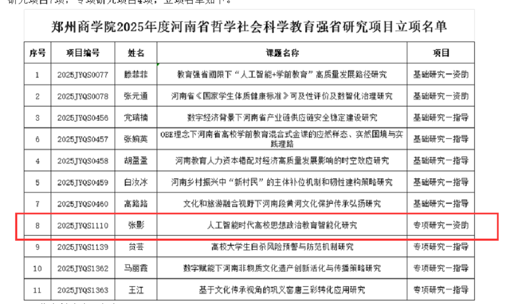 张影老师利用暑假集中精力进行科研工作,视假期为宝贵自我提升契机,全身心投入到科研工作当中。她对申报书反复雕琢、精心打磨,不放过任何一处可能影响申报结果的细节,力求做到尽善尽美。在整个暑假期间,她凭借着这份专注与执着,申请了4个项目。就在这学期,她省社科联结项荣获一等奖,并且成功立项了两个厅级带资项目,这无疑是对她假期辛勤付出的最好回报。其中,2025年度河南省哲学社会科学教学强省项目,作为资助性计划项目,资助经费2万元,学校配套1万;2025年度河南省高等学校重点科研项目资助经费3万元,学校配套1.5万元。面对这两项来之不易的科研项目,她精心规划,拟在接下来的两年时光里,发表一篇核心论文,出版一本专著。