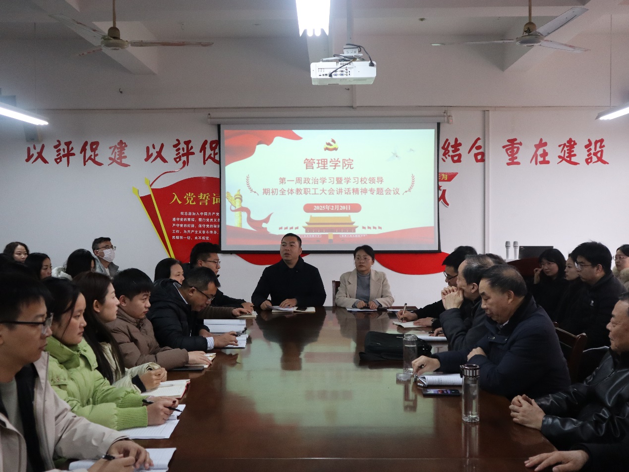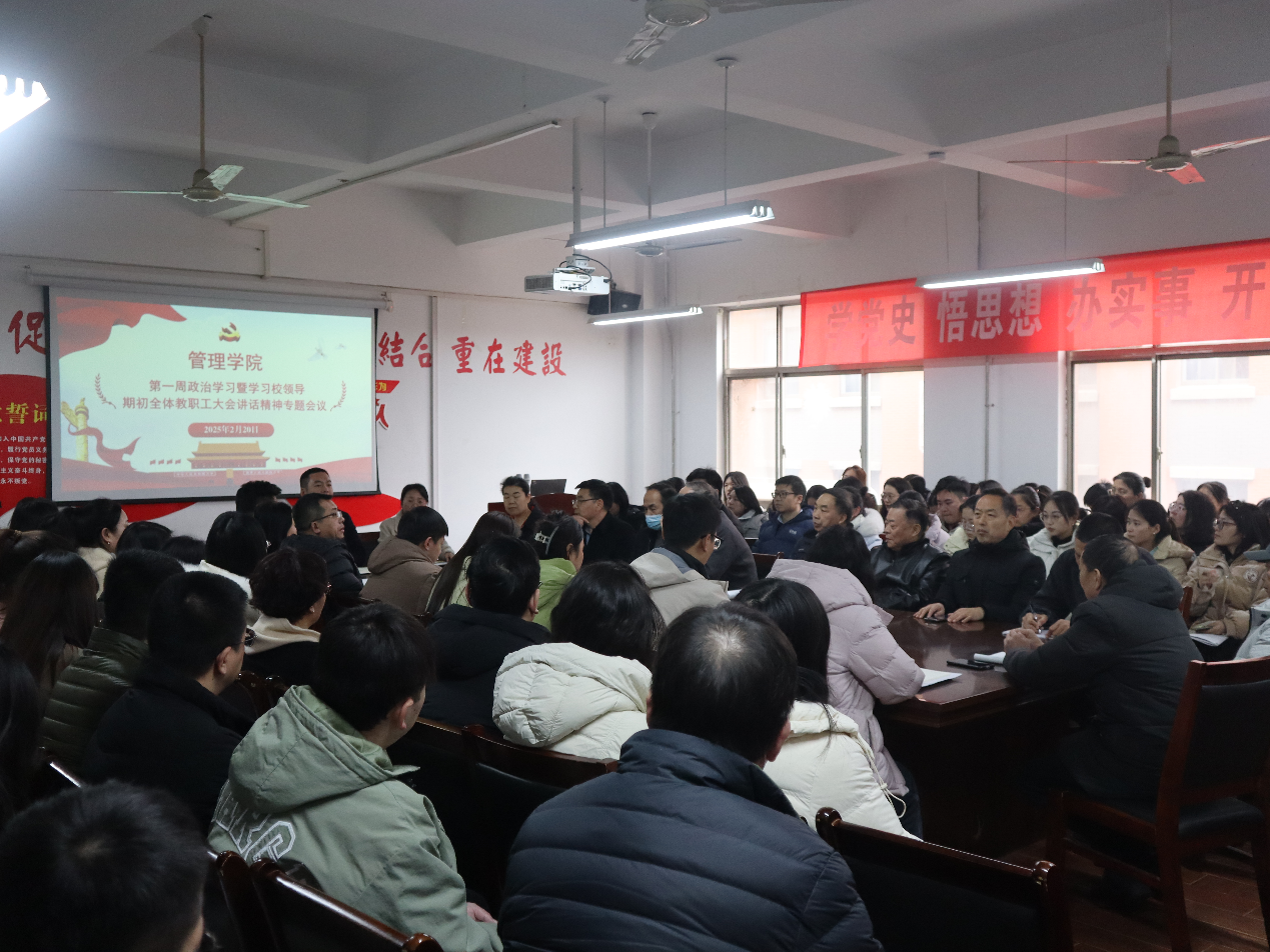 为全面学习贯彻校领导在2024-2025学年第二学期全体教职工大会上的讲话精神,更好地谋划部署新学期各项工作,2月20日,我院在2号楼二楼会议室组织深入学习期初全体教职工大会精神专题会议,我院院长李晓翠、党委书记宋森、副院长张卫丽及全体教职工参加会议。
