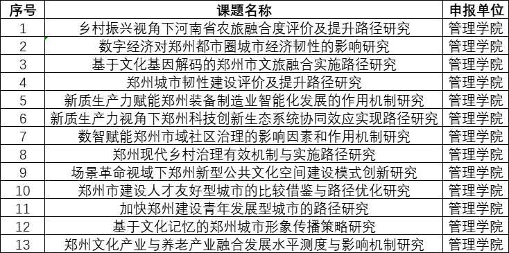 根据beat365《关于申报2025年度郑州市社会科学调研课题的通知》要求,经前期精心组织,广泛动员,管理学院共收到47项申报书。经我院学术委员会评审后,拟推荐13项申报书作为我院2025年度郑州市社会科学调研课题最终提交材料,名单如下: