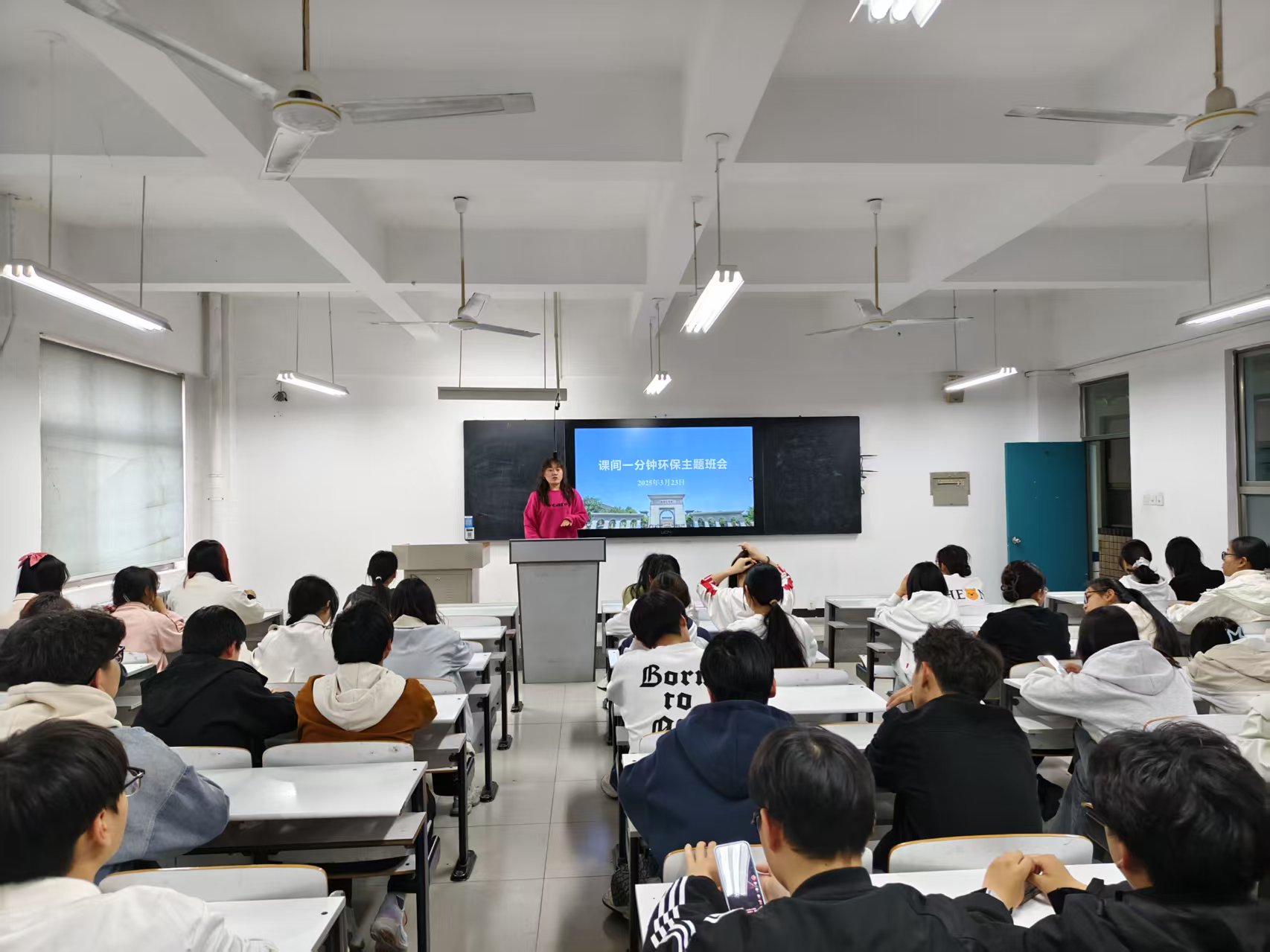 班会上,各班辅导员老师通过宣讲、案例分析等形式,向同学们阐述了维护教室卫生干净整洁的重要性,并号召大家从自身做起,共同维护整洁舒适的学习环境。班会最后,劳动委员进行了经验分享,并倡议形成维护班级卫生整洁的办法,从而确保我院“课间一分钟环保”的常态化进行。