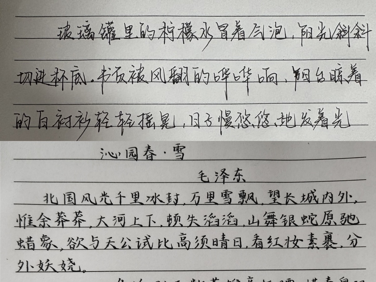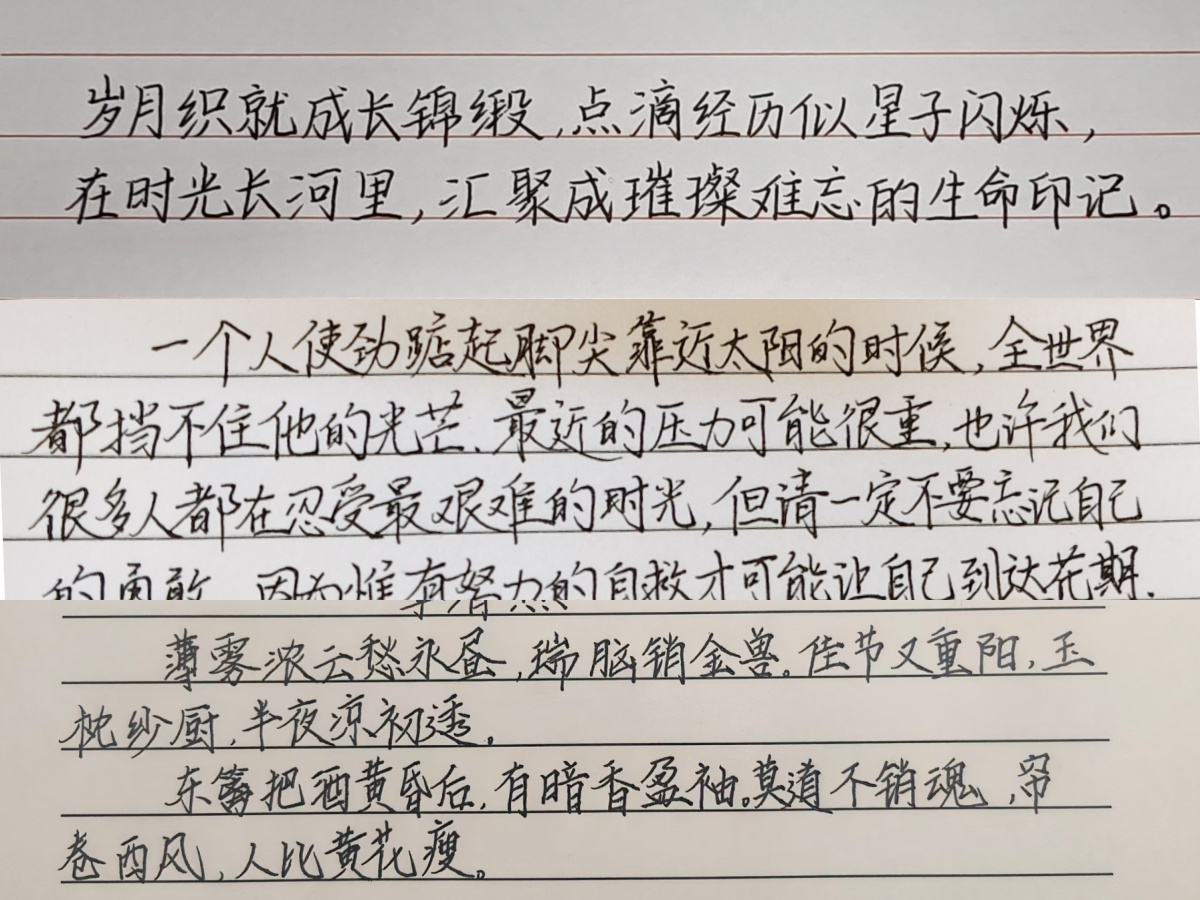 在硬笔书法赛道,选手们以细腻的笔触和严谨的结构展现了硬笔书法的独特魅力。他们的作品涵盖了楷书、行书、草书等多种字体,风格各异。有的作品工整秀丽,如同印刷体一般规范;有的作品则潇洒飘逸,充满了艺术感染力。