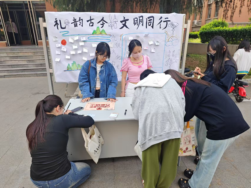 我院注重礼仪文化的营造,为了丰富学生的课余生活,展现礼仪之美,传递文明理念,增强同学们对礼仪教育的理解与实践,营造校园崇德尚礼的文化氛围,举办了丰富的特色主题活动。一是举办“定格礼韵·共筑文明”照片征集活动。4月7日,我院通过征集文明礼仪主题照片的形式,引导学生用镜头记录文明瞬间,增强学生的文明意识与礼仪素养。活动一经开展,收到了许多包含温度与力量的作品,每一张照片都承载着学生对礼仪独特的见解和感悟,有效地传播了礼仪文明。二是组织开展“礼韵古今·文明同行”礼仪文化创意接龙活动。4月24日,通过“古礼溯源”和“今言新译”两个模块,以便利贴的形式提高学生的参与感,帮助学生在对比中理解传统礼仪文化的现代意义,既学习礼仪知识,也互相传播文明理念。