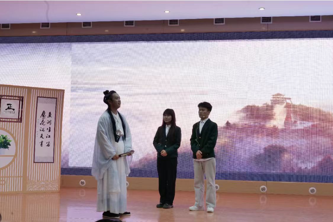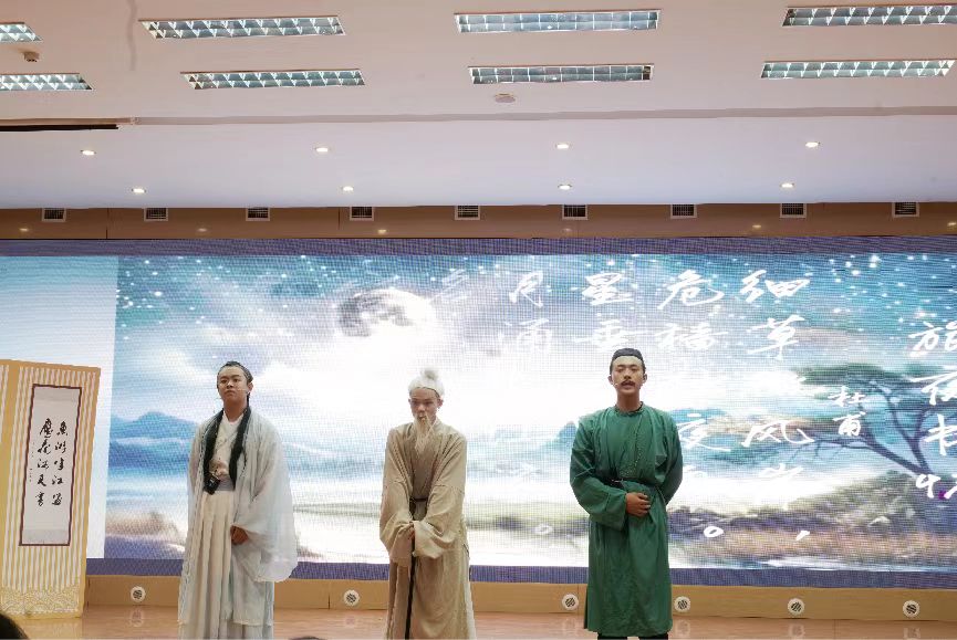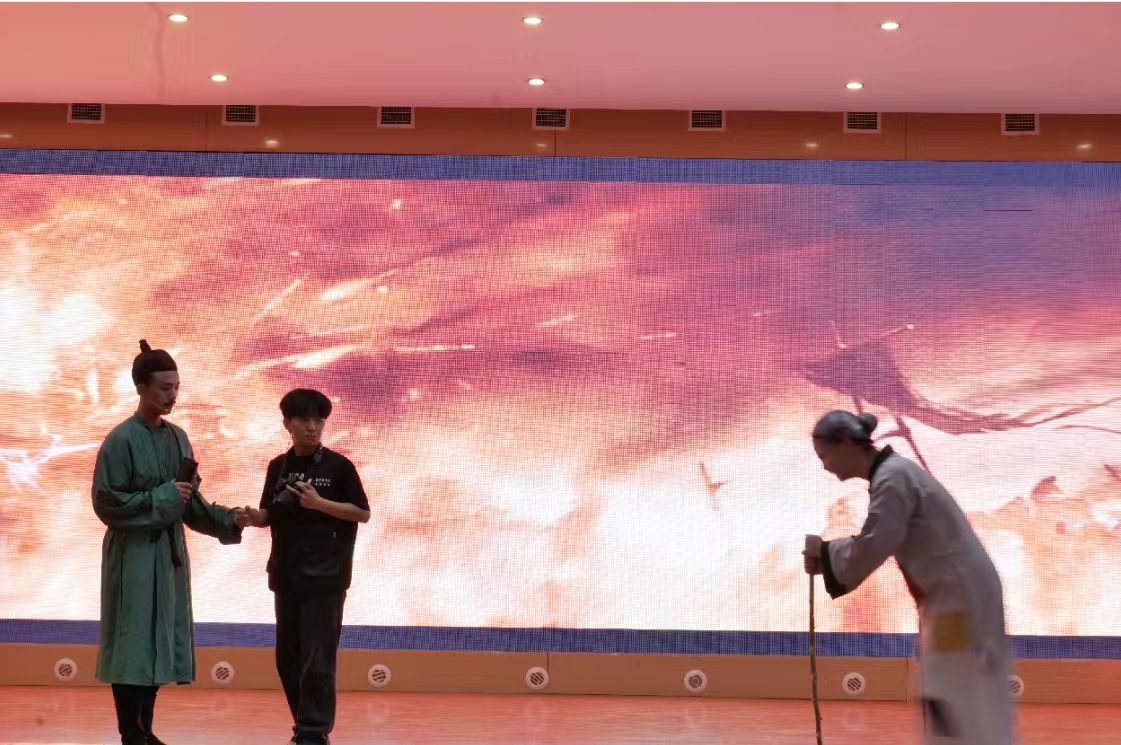 随后我院团体赛登场,我院以三幕式情景剧结构重构诗圣传奇,从青年仗剑游历的裘马清狂,到壮年颠沛吟哦的沉郁顿挫,终至暮年孤舟飘零的苍凉浑茫,将安史之乱的血火烽烟与马嵬坡变的帝国黄昏,熔铸成跌宕起伏的戏剧骨骼,凿刻出诗人精神的当代转译,更在现场穹顶下激荡出跨越千年的精神回响。
